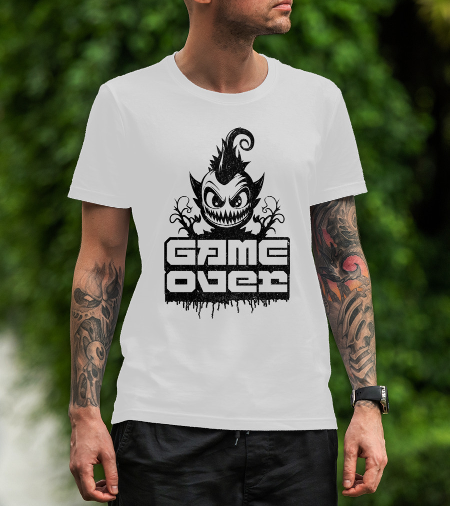 The GAME OVER Creepy Monster Icon with Sharp Teeth and Spiky Hair T-shirt is designed for everyday wear and a consistent fit. Fabric is pre-shrunk ring-spun cotton with durable stitching. See the size chart below for exact measurements.