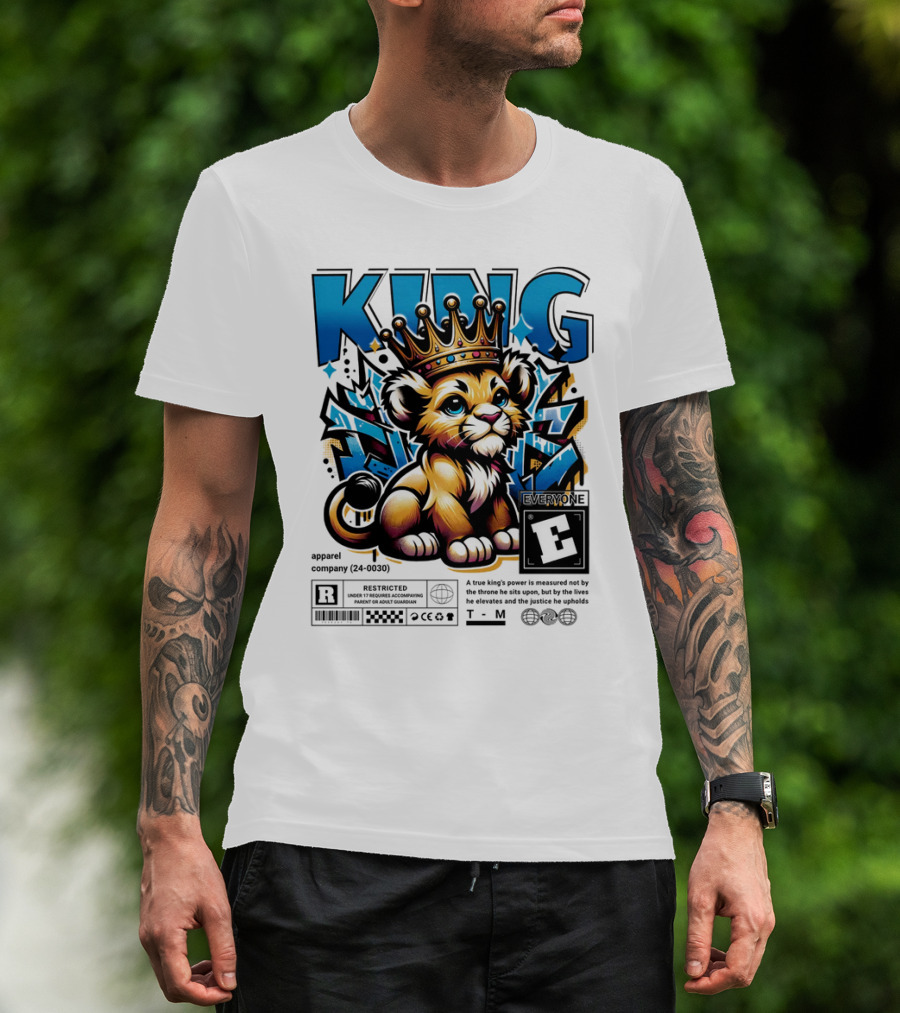 The KING Lion Cub Crown Power True Justice Gaming E Motif T-shirt is designed for everyday wear and a consistent fit. Fabric is pre-shrunk ring-spun cotton with durable stitching. See the size chart below for exact measurements.