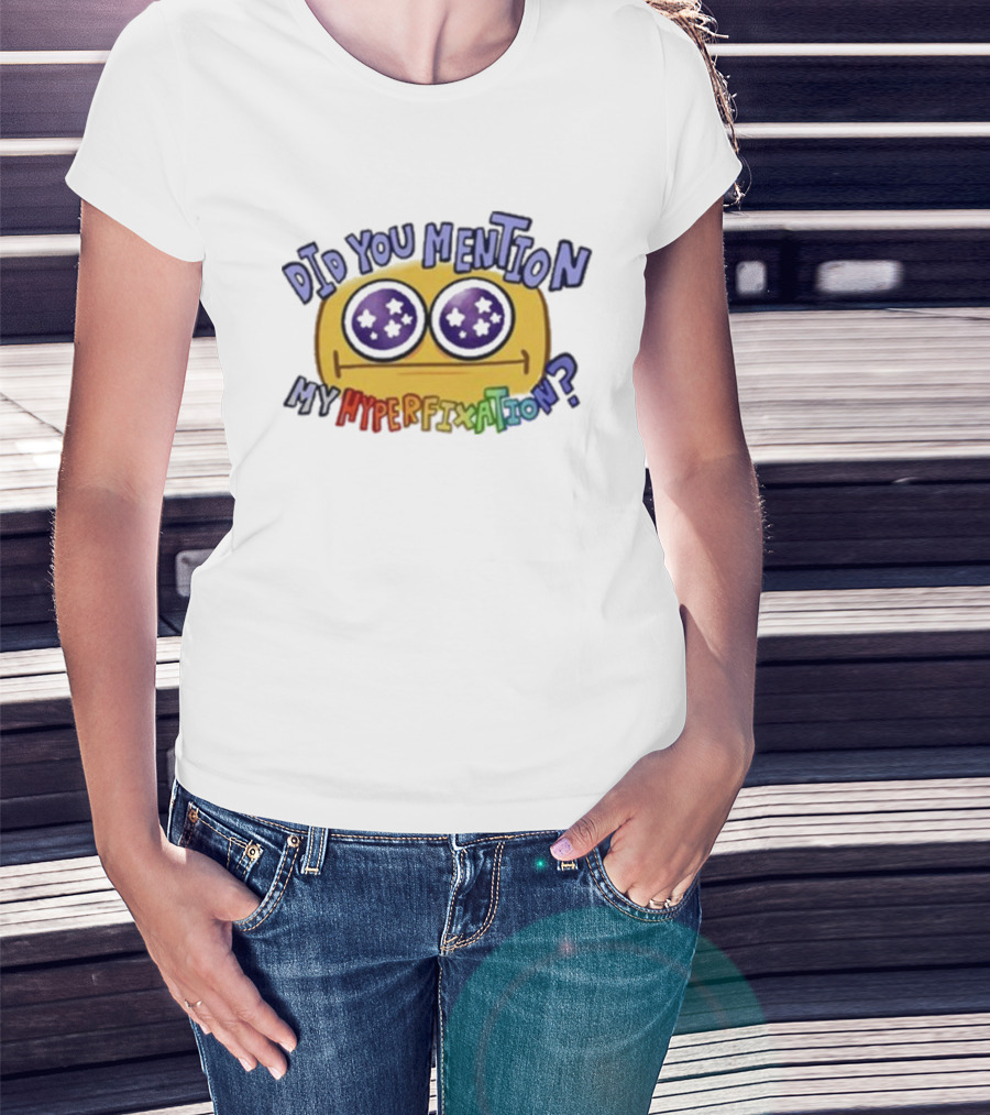 The Starry Eye Emoji Did You Mention My Hyperfixation T-shirt is designed for everyday wear and a consistent fit. Fabric is pre-shrunk ring-spun cotton with durable stitching. See the size chart below for exact measurements.