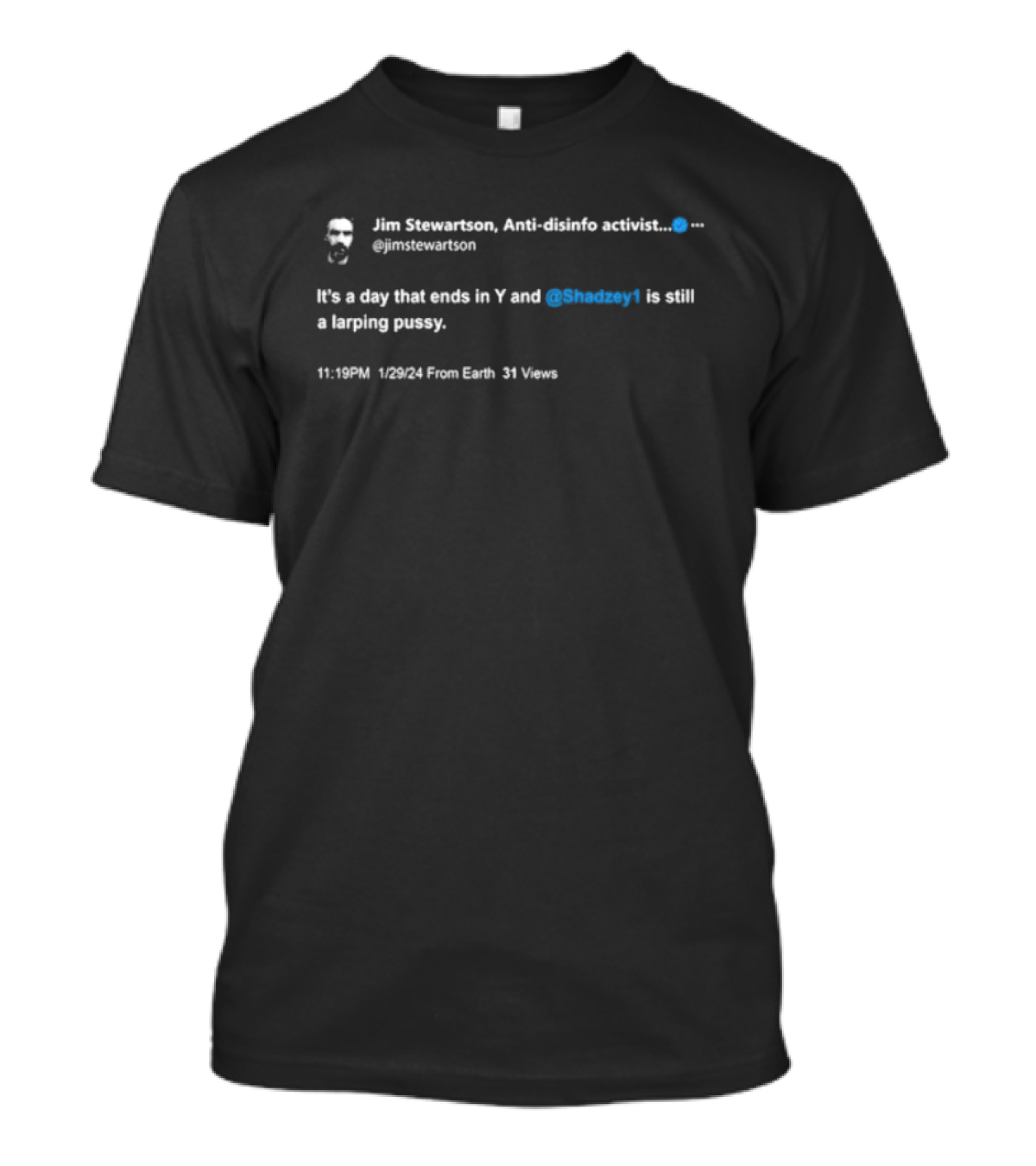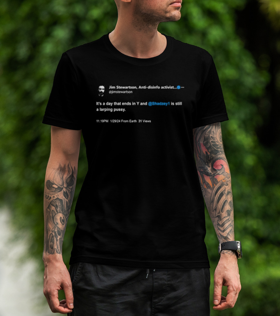 Jim Stewartson Anti-Disinfo Activist Tweet It's A Day That Ends In Y Shadzey1 Larping Comment T-Shirt