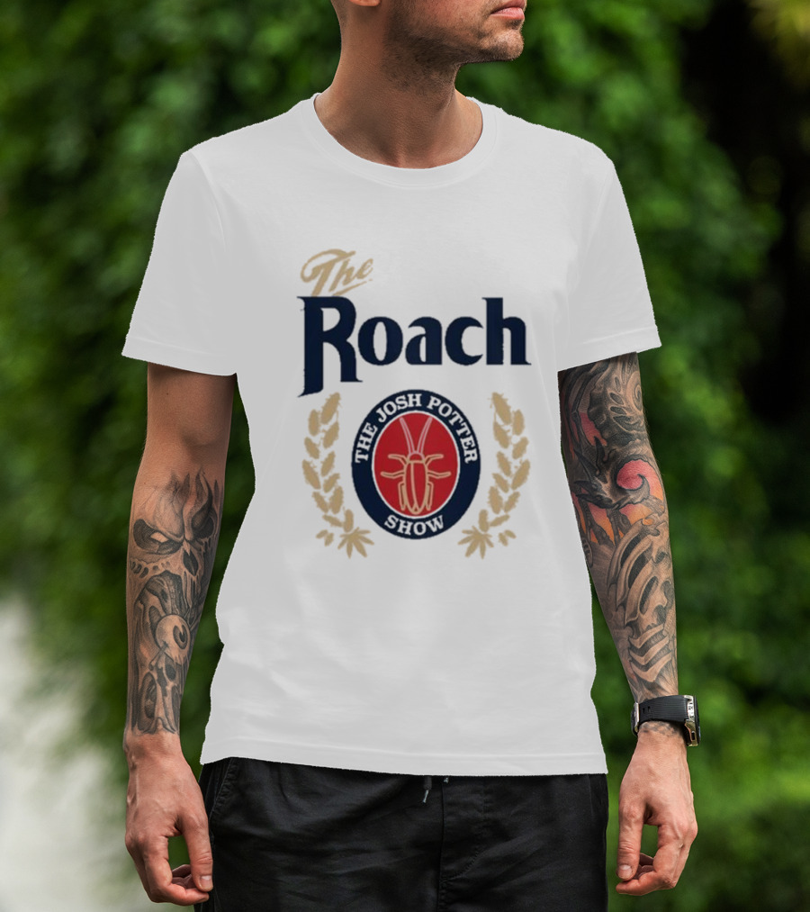 The The Josh Potter Show The Roach Emblem with Laurel Wreath and Insect T-shirt is designed for everyday wear and a consistent fit. Fabric is pre-shrunk ring-spun cotton with durable stitching. See the size chart below for exact measurements.
