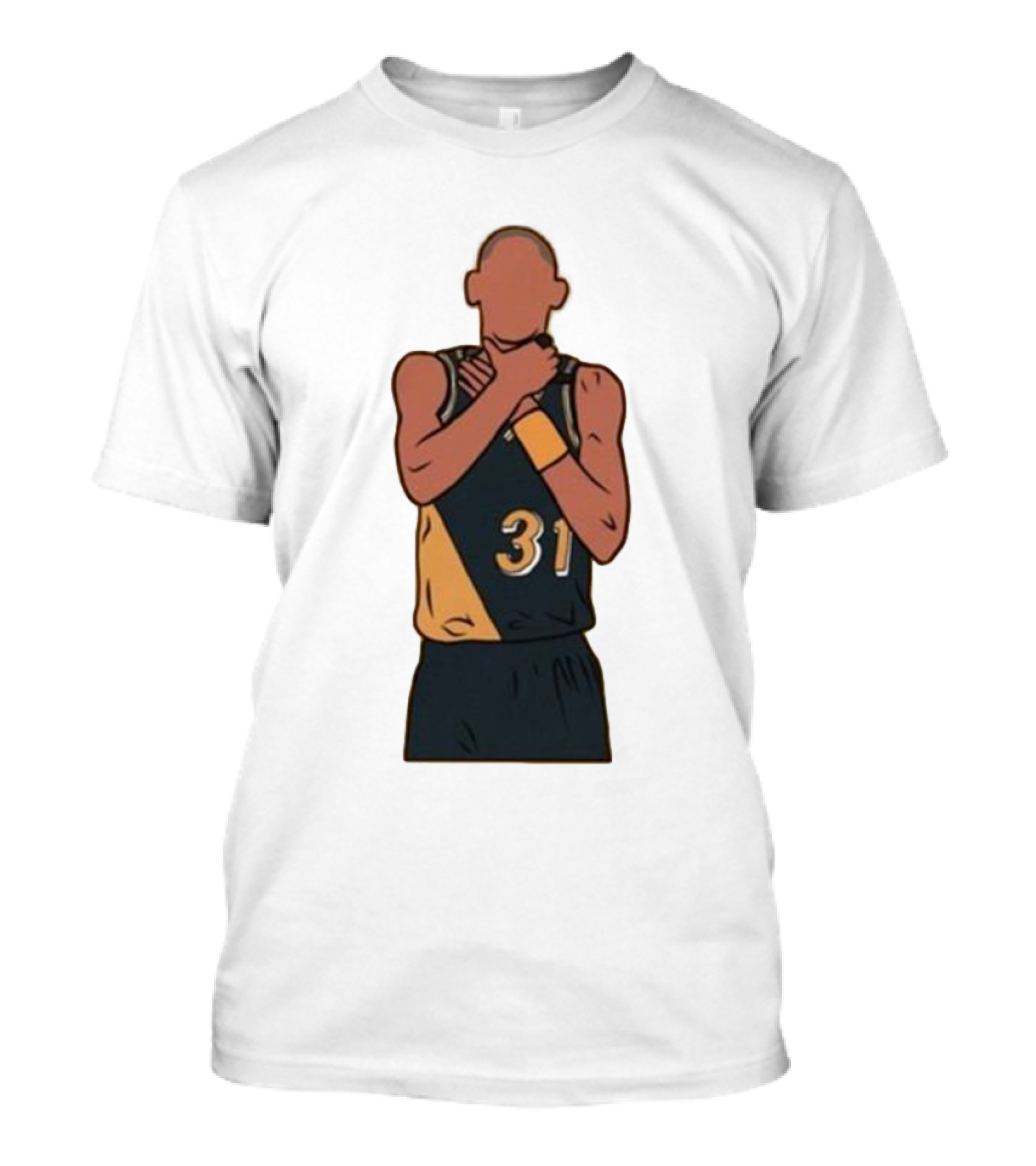 The Reggie Miller Choke Gesture Number 31 Basketball T-shirt is designed for everyday wear and a consistent fit. Fabric is pre-shrunk ring-spun cotton with durable stitching. See the size chart below for exact measurements.
