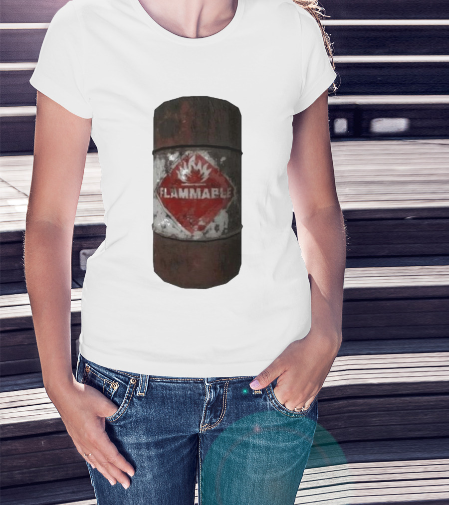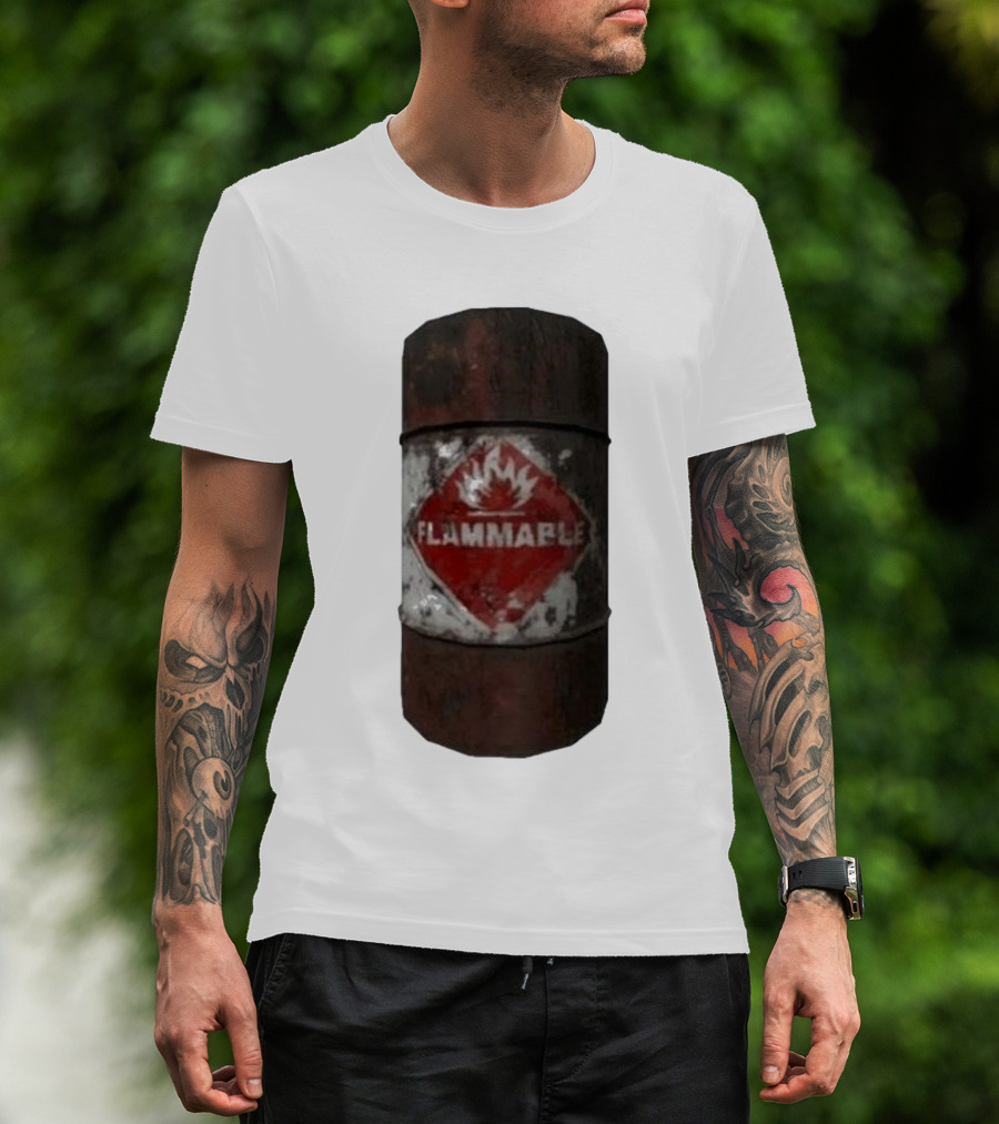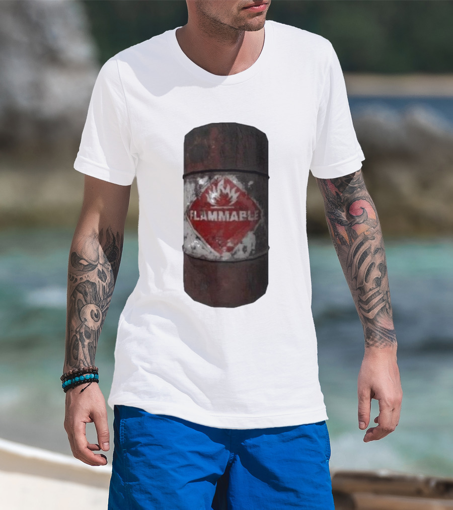 The Flammable Barrel Red Hazard T-shirt is designed for everyday wear and a consistent fit. Fabric is pre-shrunk ring-spun cotton with durable stitching. See the size chart below for exact measurements.