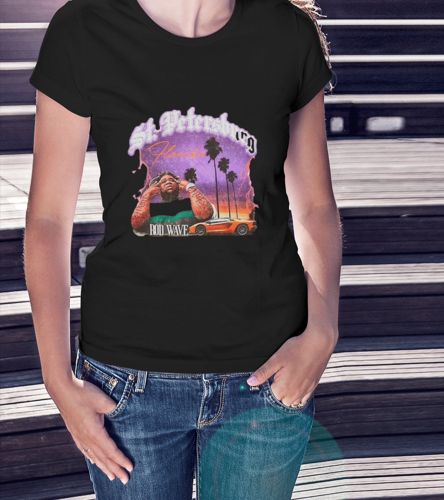 The St. Petersburg Florida Rod Wave Purple Sunset Orange Car Palm Trees T-shirt is designed for everyday wear and a consistent fit. Fabric is pre-shrunk ring-spun cotton with durable stitching. See the size chart below for exact measurements.