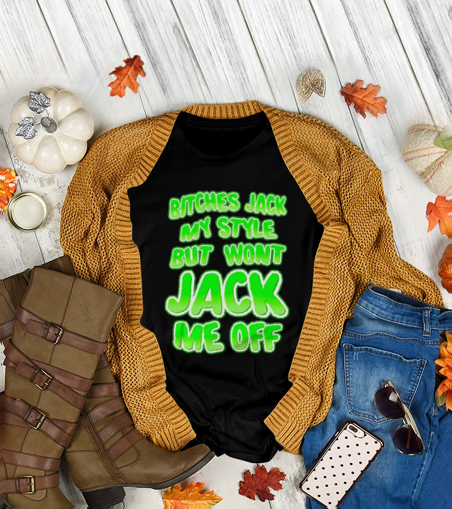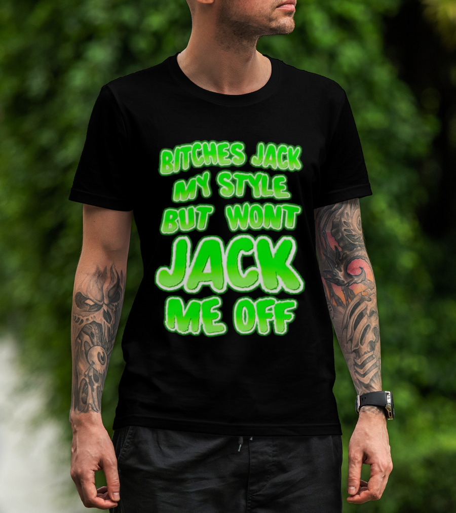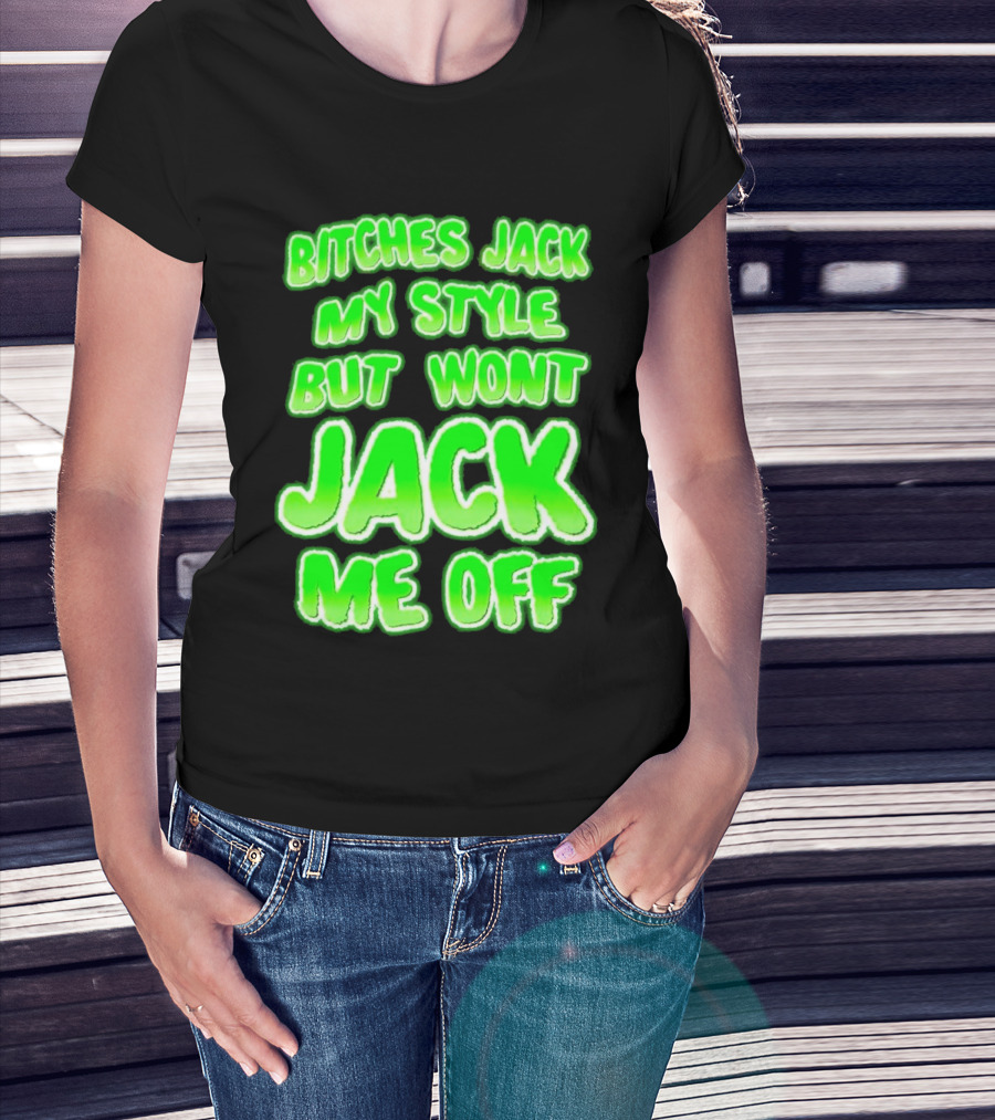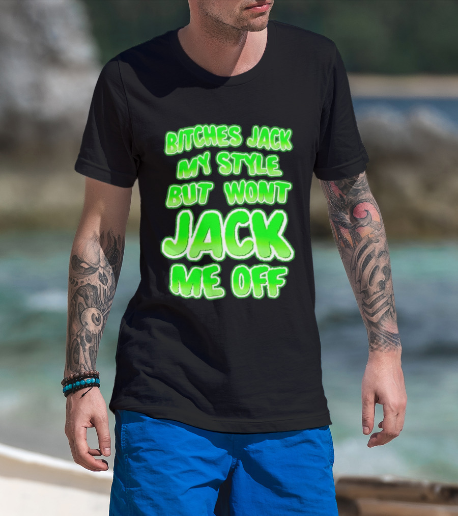 The Bitches Jack My Style Won't Jack Me Off Neon Green Textual T-shirt is designed for everyday wear and a consistent fit. Fabric is pre-shrunk ring-spun cotton with durable stitching. See the size chart below for exact measurements.