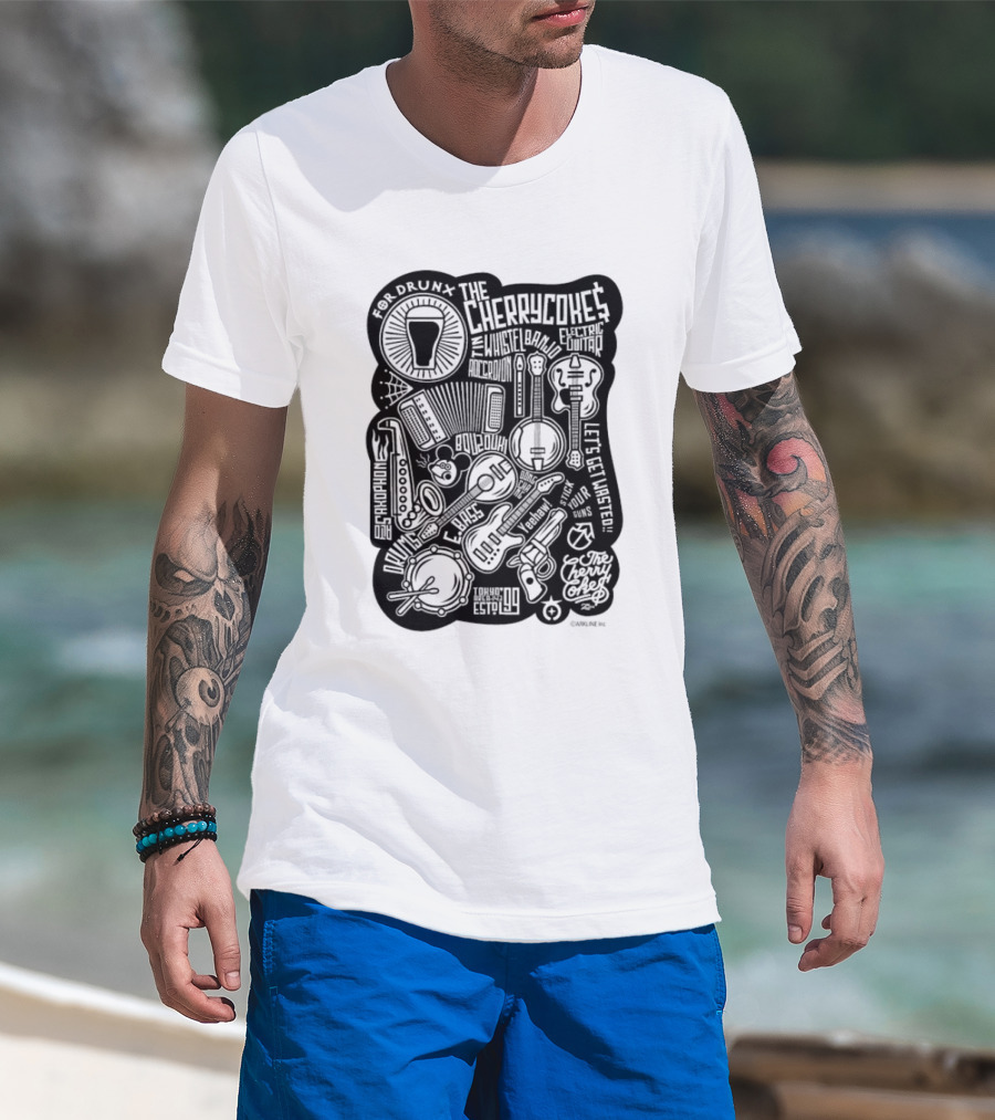 The For Drunk The Cherry Cokes Electric Guitar Whistle Accordion Band Saxophone Drums Let's Get Wasted T-shirt is designed for everyday wear and a consistent fit. Fabric is pre-shrunk ring-spun cotton with durable stitching. See the size chart below for exact measurements.