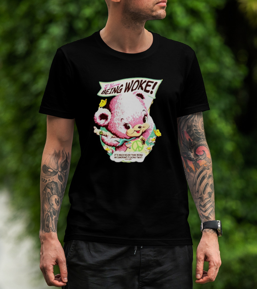 I Love Being Woke It’s Much Nicer Than Being An Ignorant Fuking Twat Cute Bear With Peace Symbol And Butterflies T-Shirt
