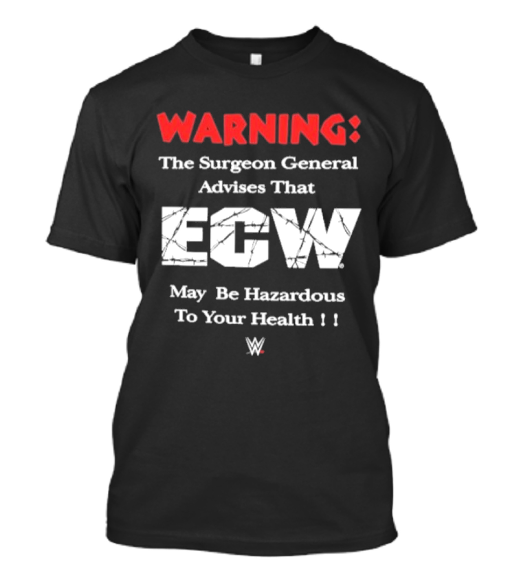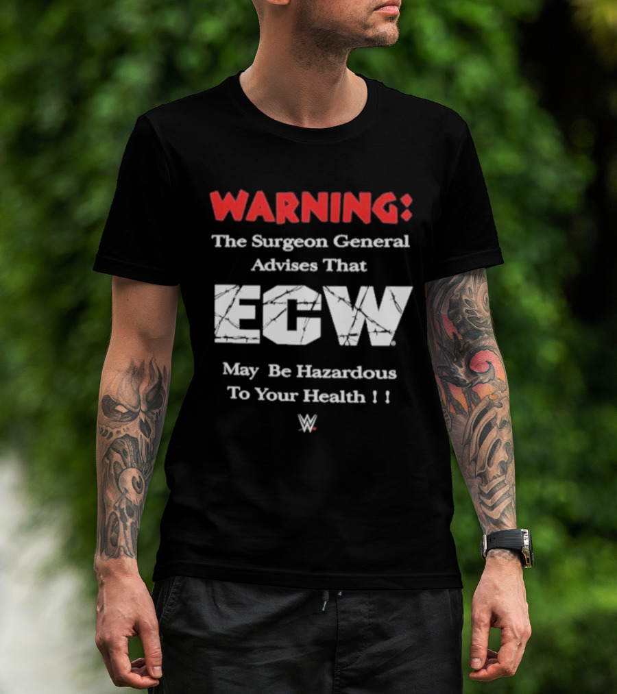 The Warning The Surgeon General Advises That ECW May Be Hazardous To Your Health WWE T-shirt is designed for everyday wear and a consistent fit. Fabric is pre-shrunk ring-spun cotton with durable stitching. See the size chart below for exact measurements.