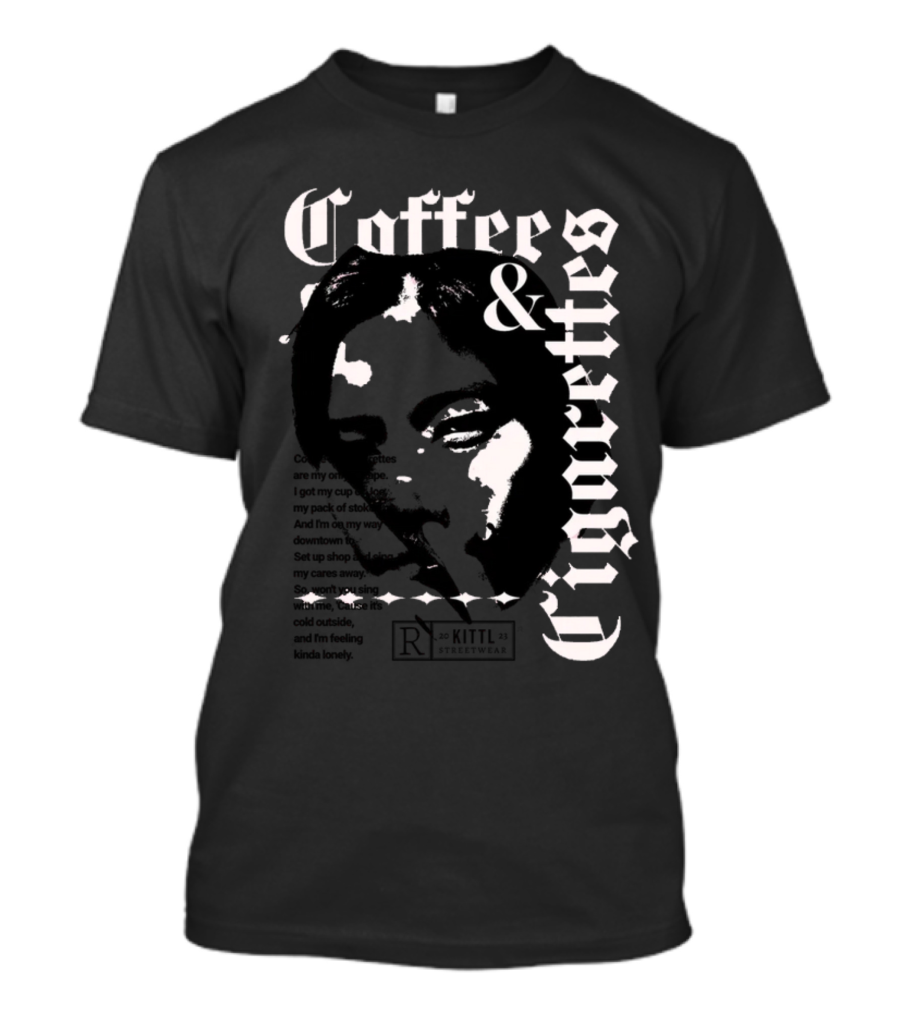 The Coffee and Cigarettes Kittl T-shirt is designed for everyday wear and a consistent fit. Fabric is pre-shrunk ring-spun cotton with durable stitching. See the size chart below for exact measurements.