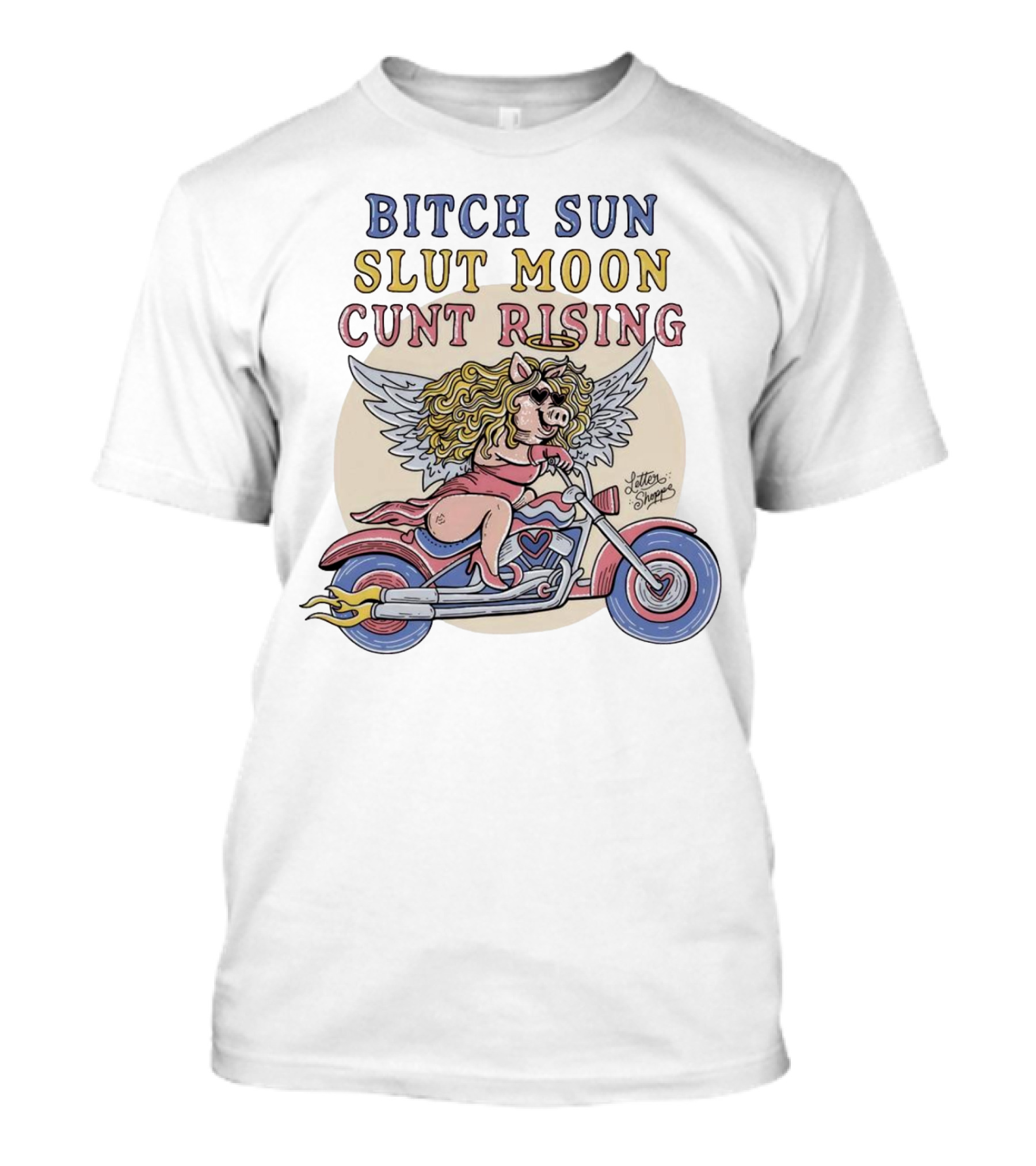 The Bitch Sun Slut Moon Cunt Rising Winged Pig on Motorcycle T-shirt is designed for everyday wear and a consistent fit. Fabric is pre-shrunk ring-spun cotton with durable stitching. See the size chart below for exact measurements.