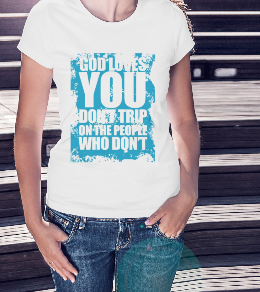 God Loves You Don't Trip On The People Who Don't Blue Distressed Print T-Shirt