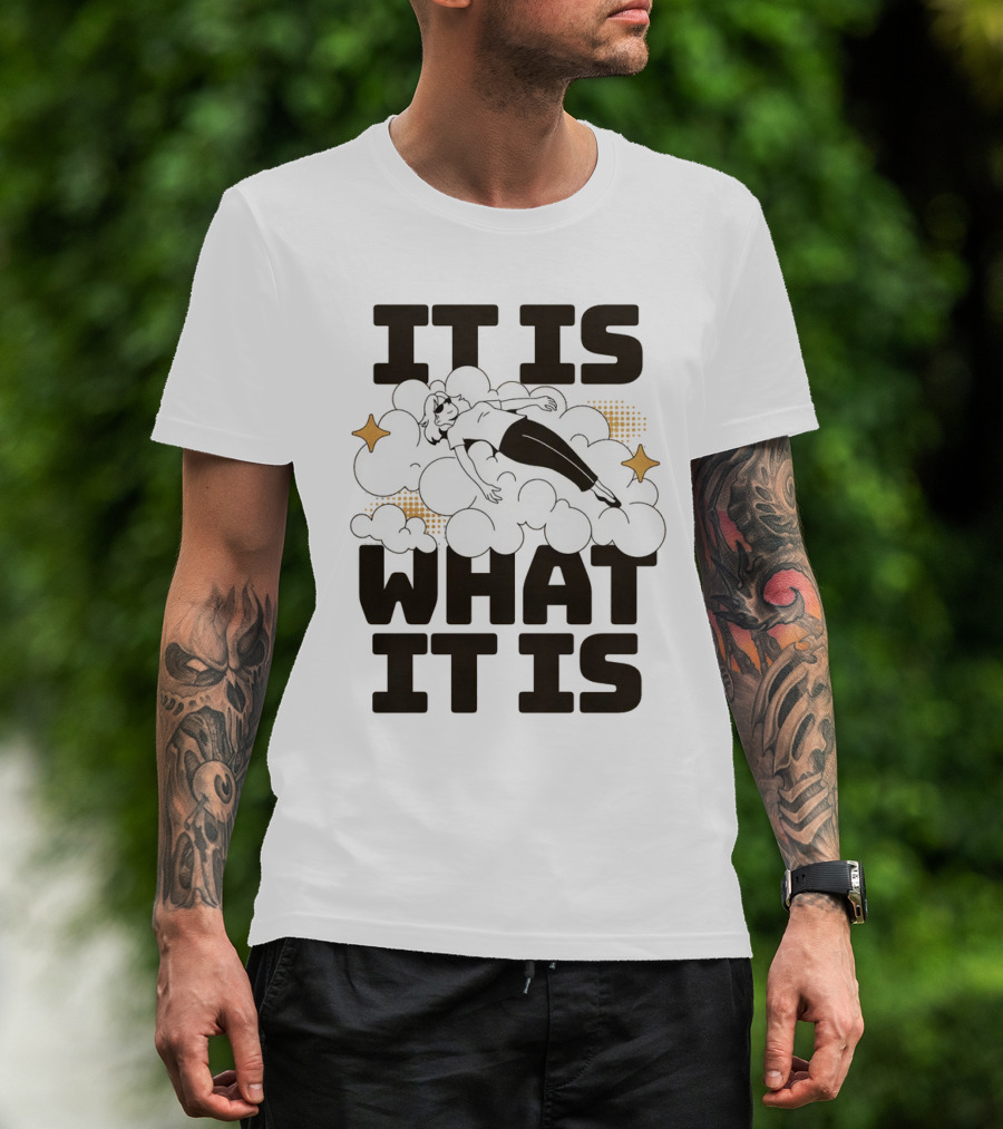 The IT IS WHAT IT IS Clouds and Stars Relaxed Figure T-shirt is designed for everyday wear and a consistent fit. Fabric is pre-shrunk ring-spun cotton with durable stitching. See the size chart below for exact measurements.