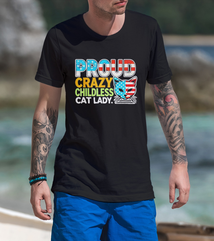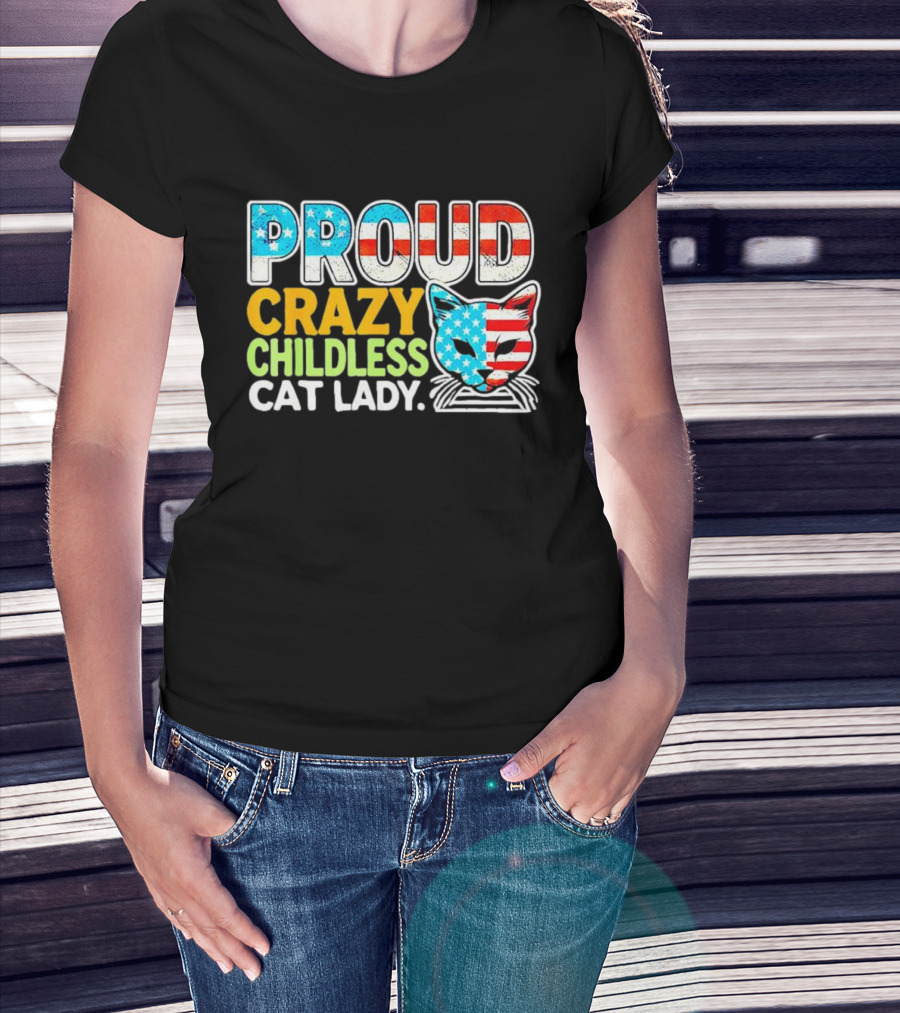 Proud Crazy Childless Cat Lady American Flag Cat Head T-Shirt
