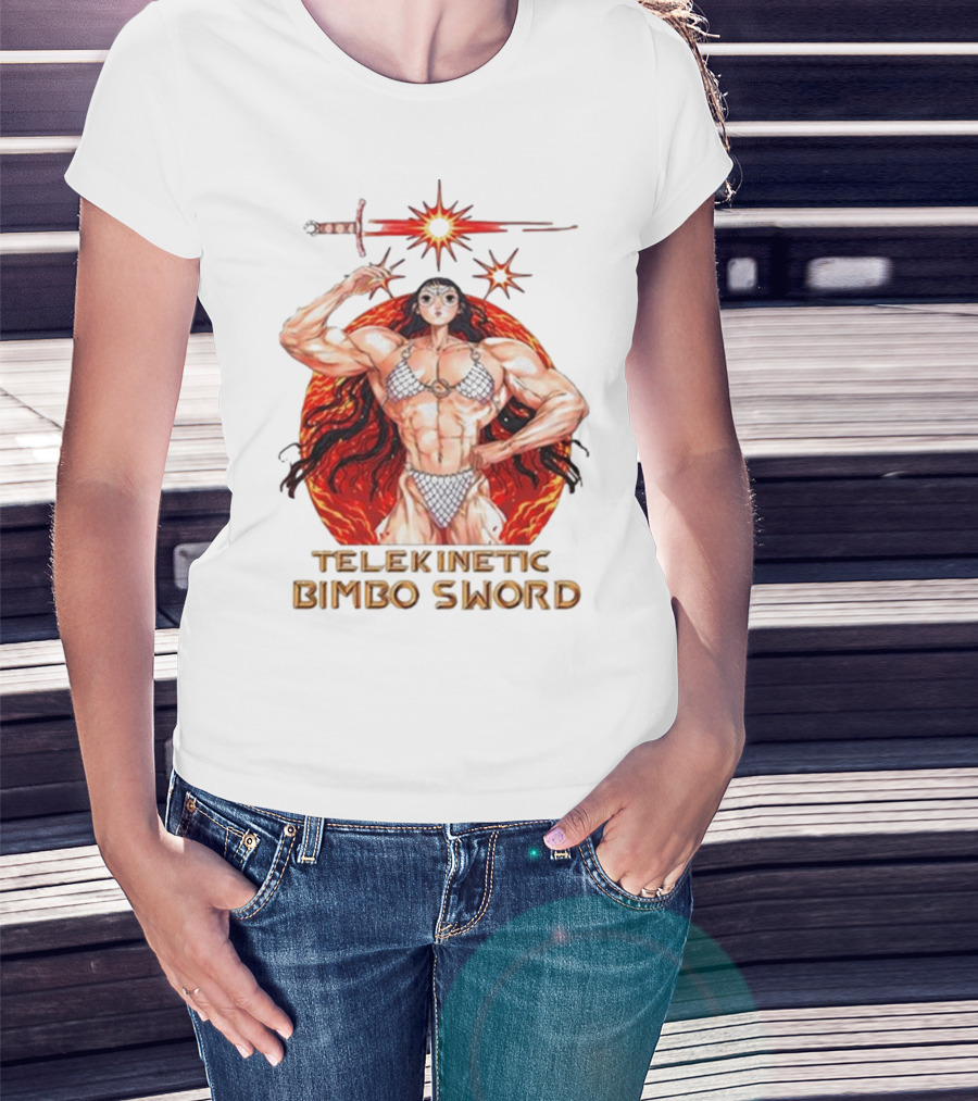 Rebecca Kirby Telekinetic Bimbo Sword Warrior With Fiery Background T-Shirt