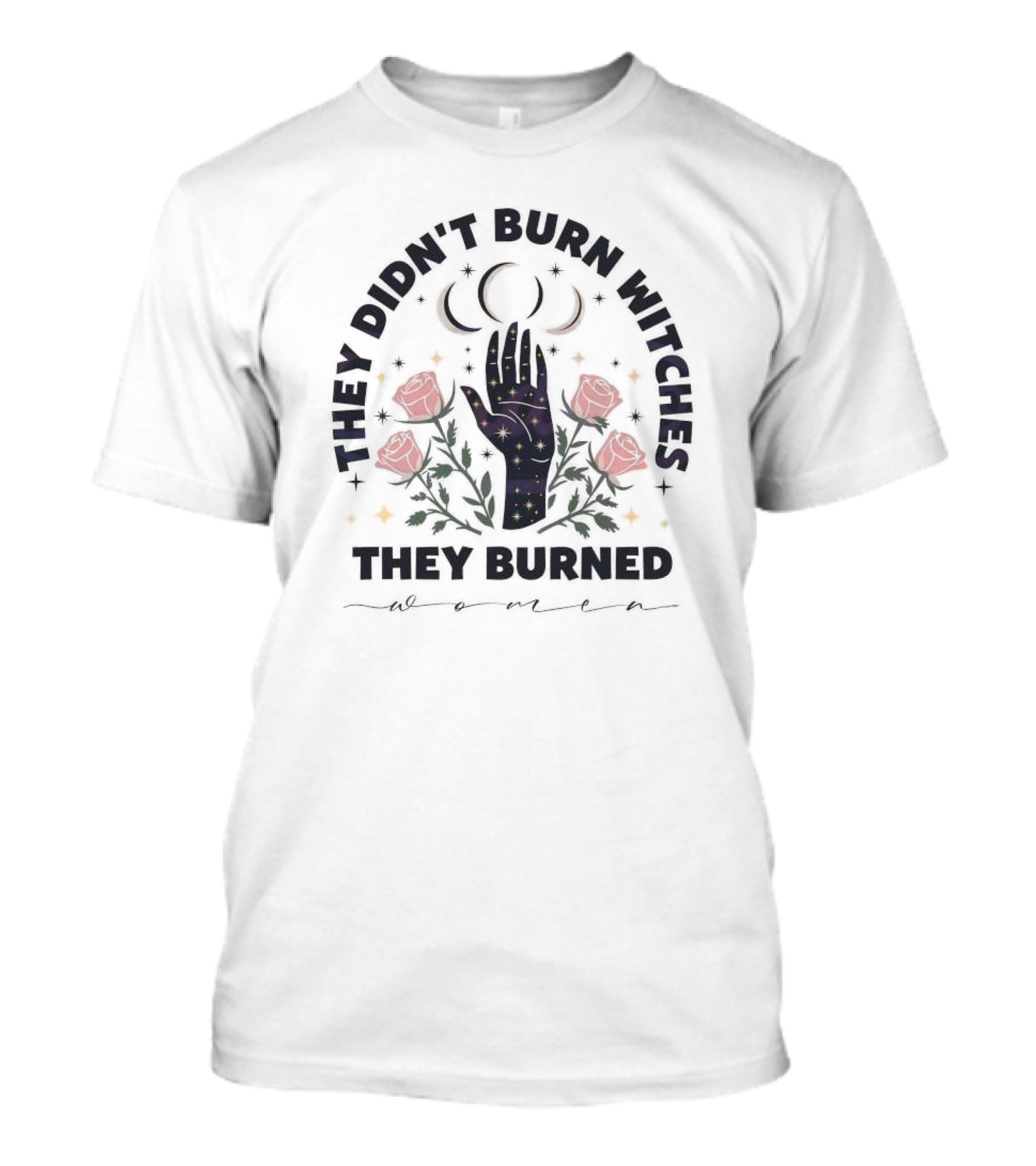 The They Didn’t Burn Witches They Burned Women with Cosmic Hand and Roses T-shirt is designed for everyday wear and a consistent fit. Fabric is pre-shrunk ring-spun cotton with durable stitching. See the size chart below for exact measurements.