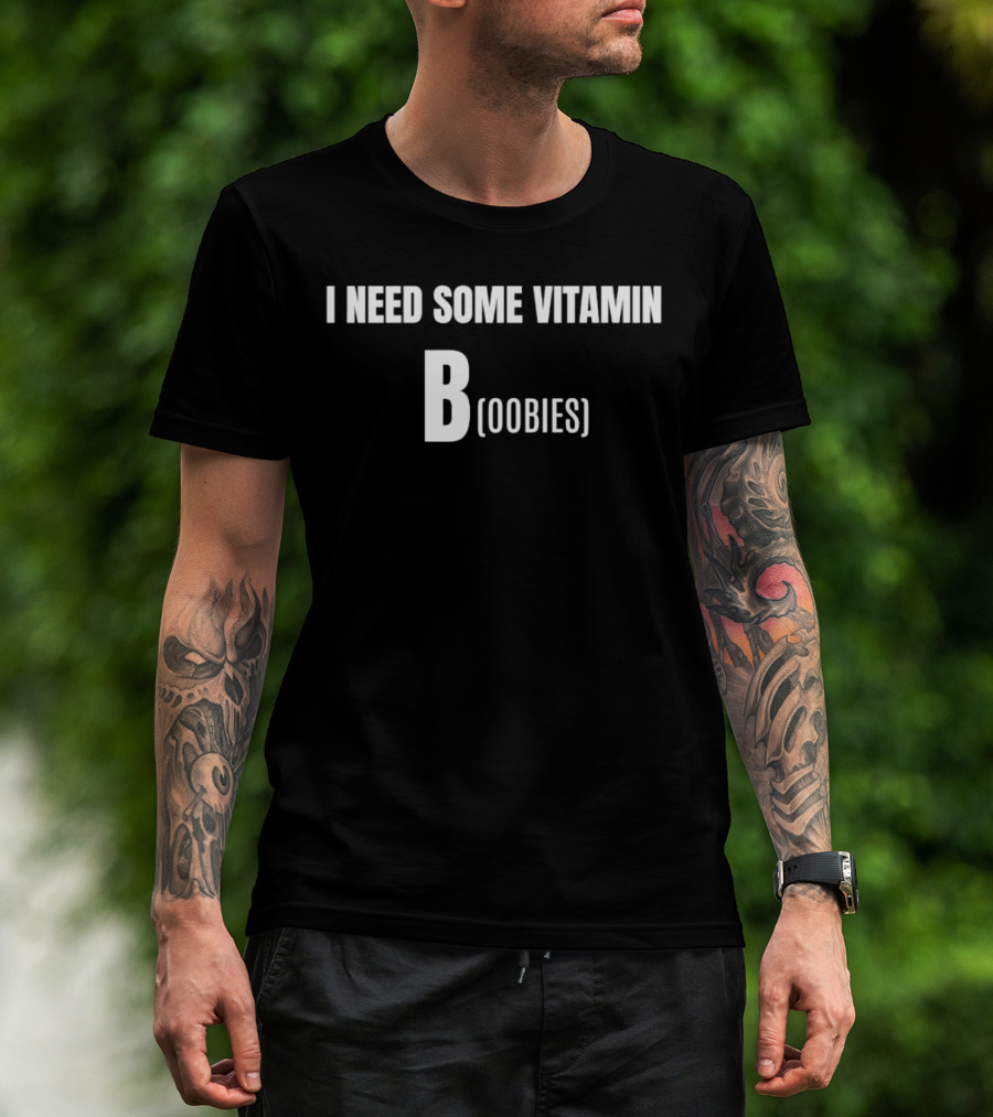 The I Need Some Vitamin B Boobies T-shirt is designed for everyday wear and a consistent fit. Fabric is pre-shrunk ring-spun cotton with durable stitching. See the size chart below for exact measurements.