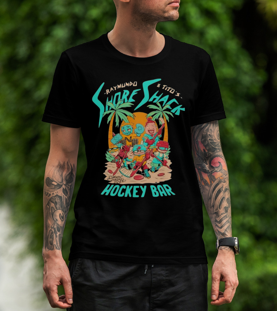 Raymundo And Tito's Shore Shack Hockey Bar Cartoon On The Beach With Hockey Players And Palm Trees T-Shirt