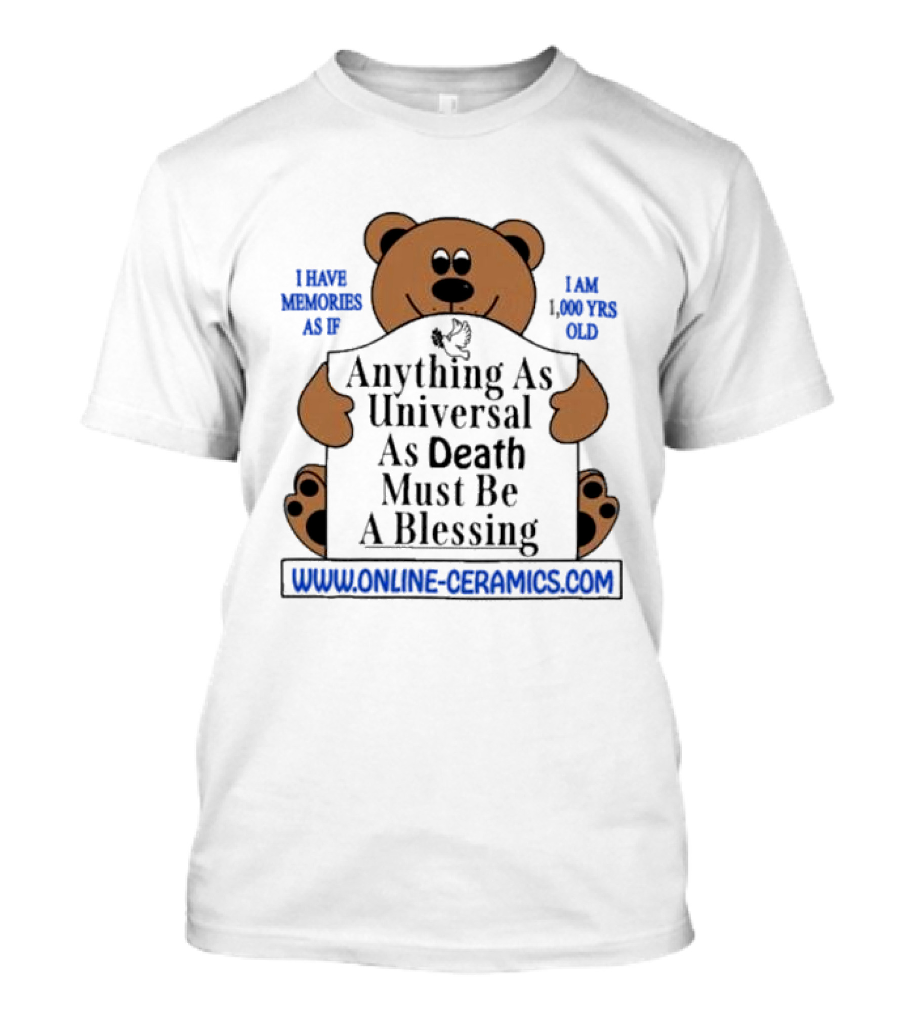 The Online Ceramics Bear with Anything As Universal As Death Must Be A Blessing Text T-shirt is designed for everyday wear and a consistent fit. Fabric is pre-shrunk ring-spun cotton with durable stitching. See the size chart below for exact measurements.