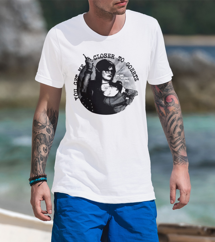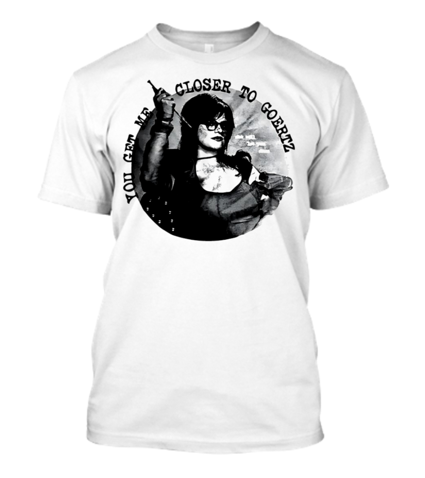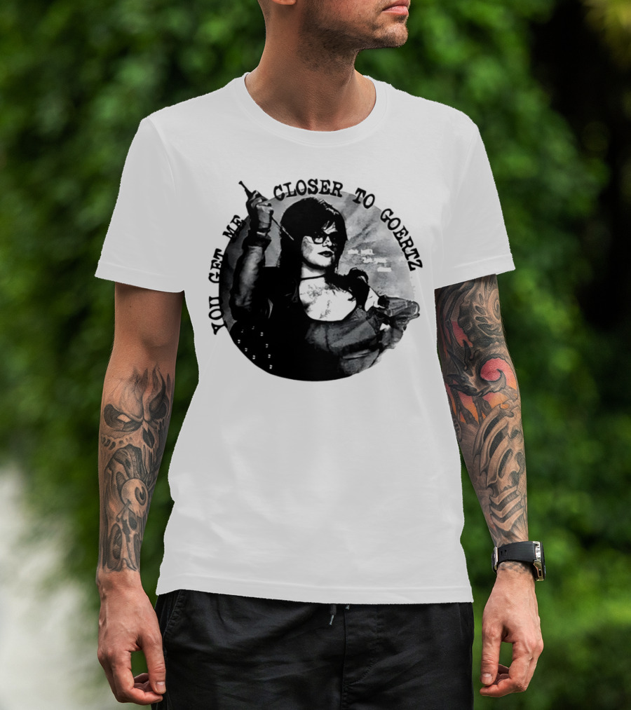 The You Get Me Closer to Goertz with Character Holding Needle and Thread T-shirt is designed for everyday wear and a consistent fit. Fabric is pre-shrunk ring-spun cotton with durable stitching. See the size chart below for exact measurements.
