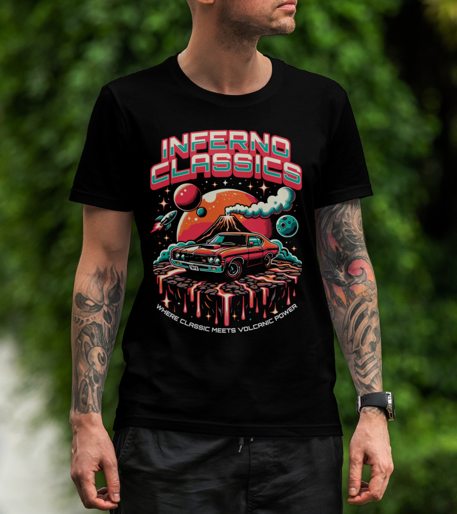 INFERNO CLASSICS WHERE CLASSIC MEETS VOLCANIC POWER PLANETARY MUSCLE CAR VOLCANO SCENE T-Shirt