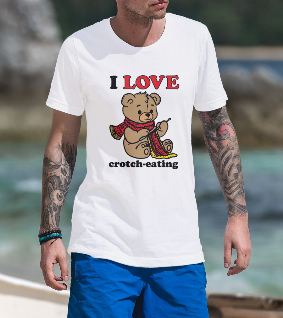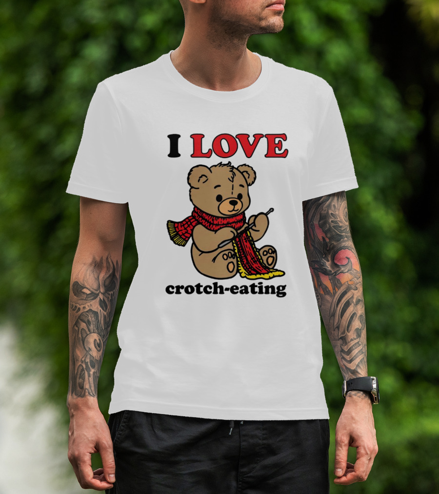 The I Love Crotch-Eating Bear Wearing Scarf and Knitting T-shirt is designed for everyday wear and a consistent fit. Fabric is pre-shrunk ring-spun cotton with durable stitching. See the size chart below for exact measurements.