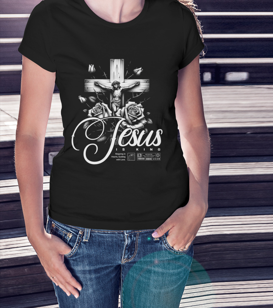 Jesus Is King Reigning In Hearts Guiding With Love Roses Cross Crucifixion R Restricted T-Shirt