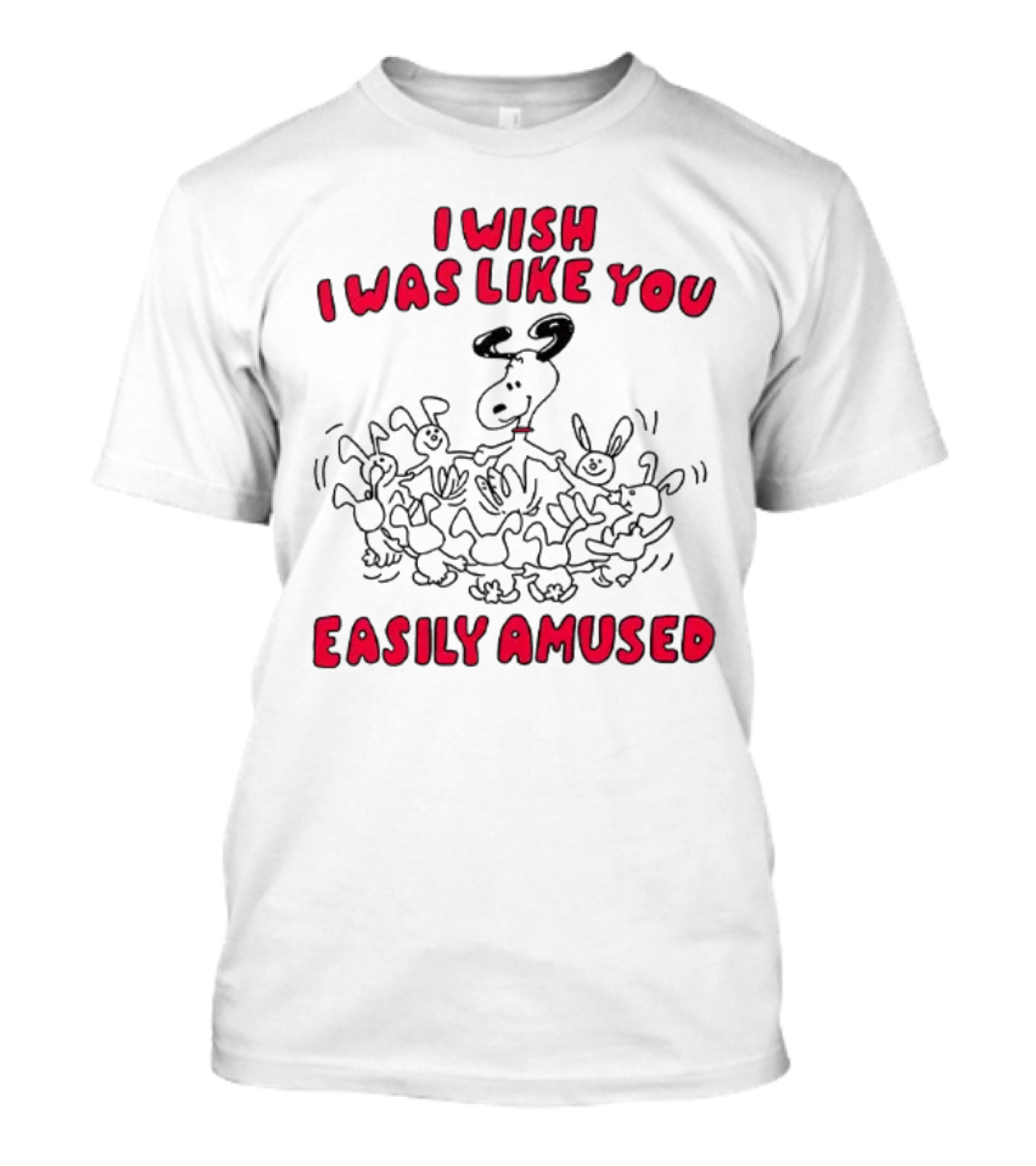 The I Wish I Was Like You Easily Amused Black and Red Cartoon Character Surrounded by Dancing Bunnies T-shirt is designed for everyday wear and a consistent fit. Fabric is pre-shrunk ring-spun cotton with durable stitching. See the size chart below for exact measurements.
