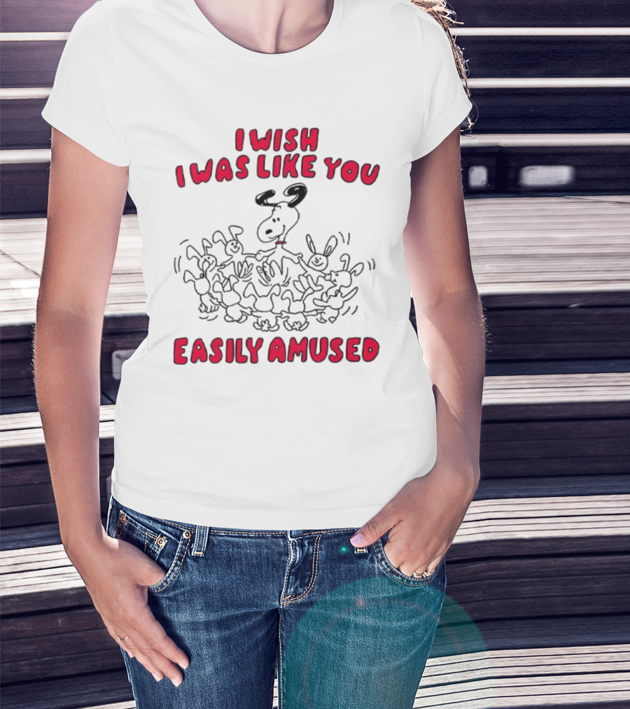 I Wish I Was Like You Easily Amused Black And Red Cartoon Character Surrounded By Dancing Bunnies T-Shirt