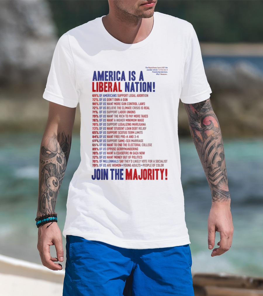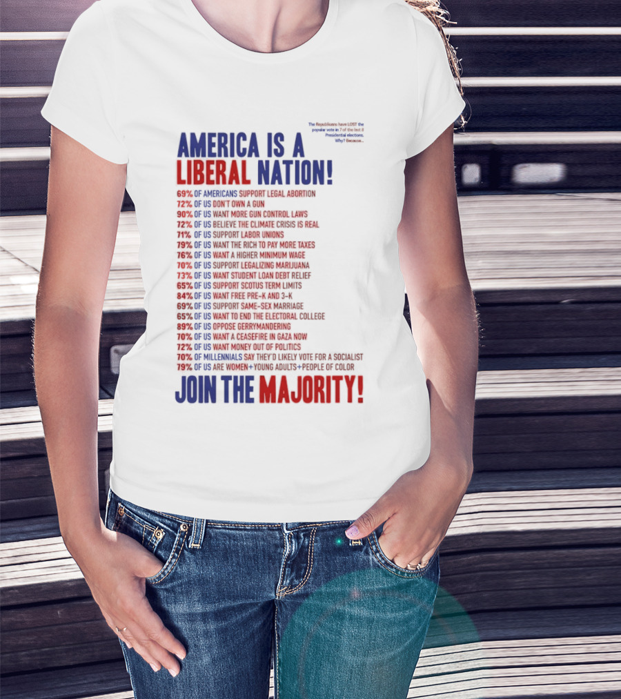 The America is a Liberal Nation 69% of Americans Support Legal Abortion Join the Majority T-shirt is designed for everyday wear and a consistent fit. Fabric is pre-shrunk ring-spun cotton with durable stitching. See the size chart below for exact measurements.