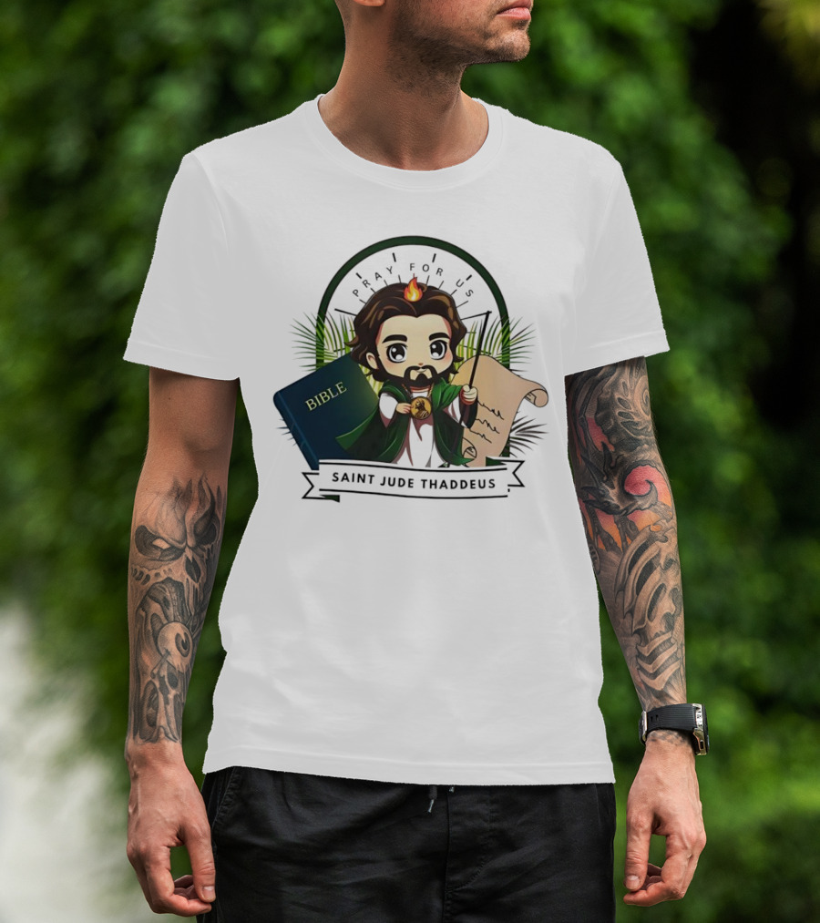 Saint Jude Thaddeus Pray For Us Cartoon Bible Scroll Flame T-Shirt