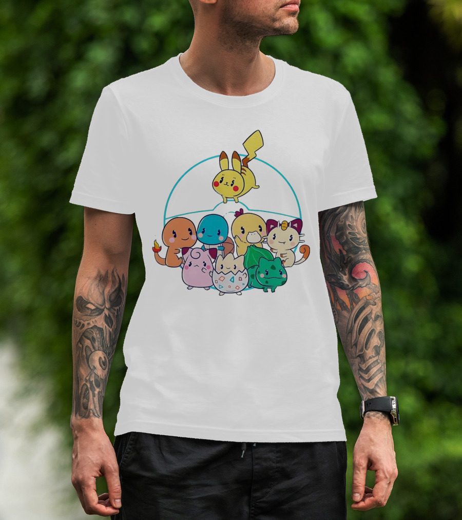 The Kawaii Pokes Pikachu Bulbasaur Charmander Squirtle Cuties T-shirt is designed for everyday wear and a consistent fit. Fabric is pre-shrunk ring-spun cotton with durable stitching. See the size chart below for exact measurements.