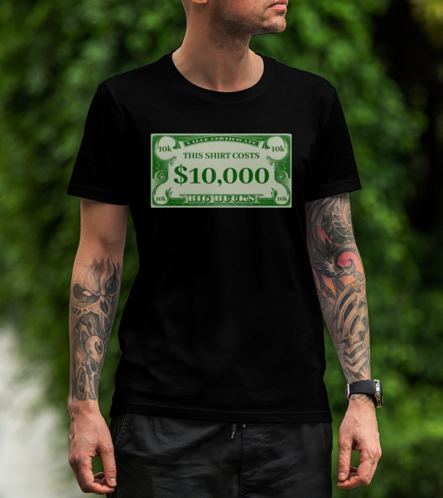 The Value Certificate 10k This Shirt Costs $10,000 Big Bucks T-shirt is designed for everyday wear and a consistent fit. Fabric is pre-shrunk ring-spun cotton with durable stitching. See the size chart below for exact measurements.