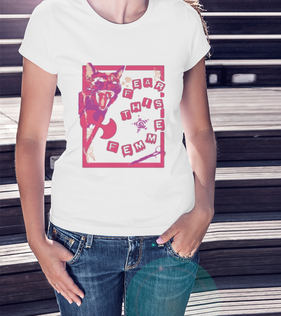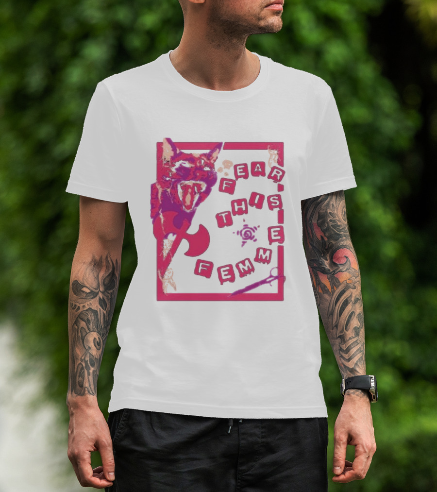 Fear This Femme Cat And Axe Retro Typography Pink Acid Wash T-Shirt