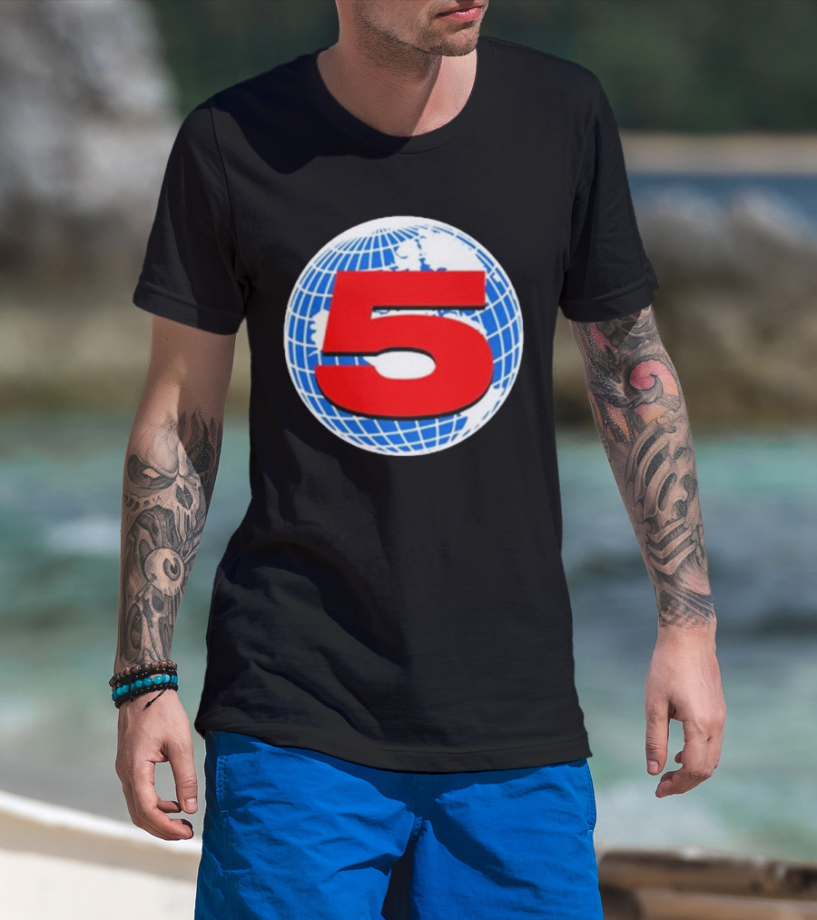 Red Number 5 On Blue And White Globe Background T-Shirt