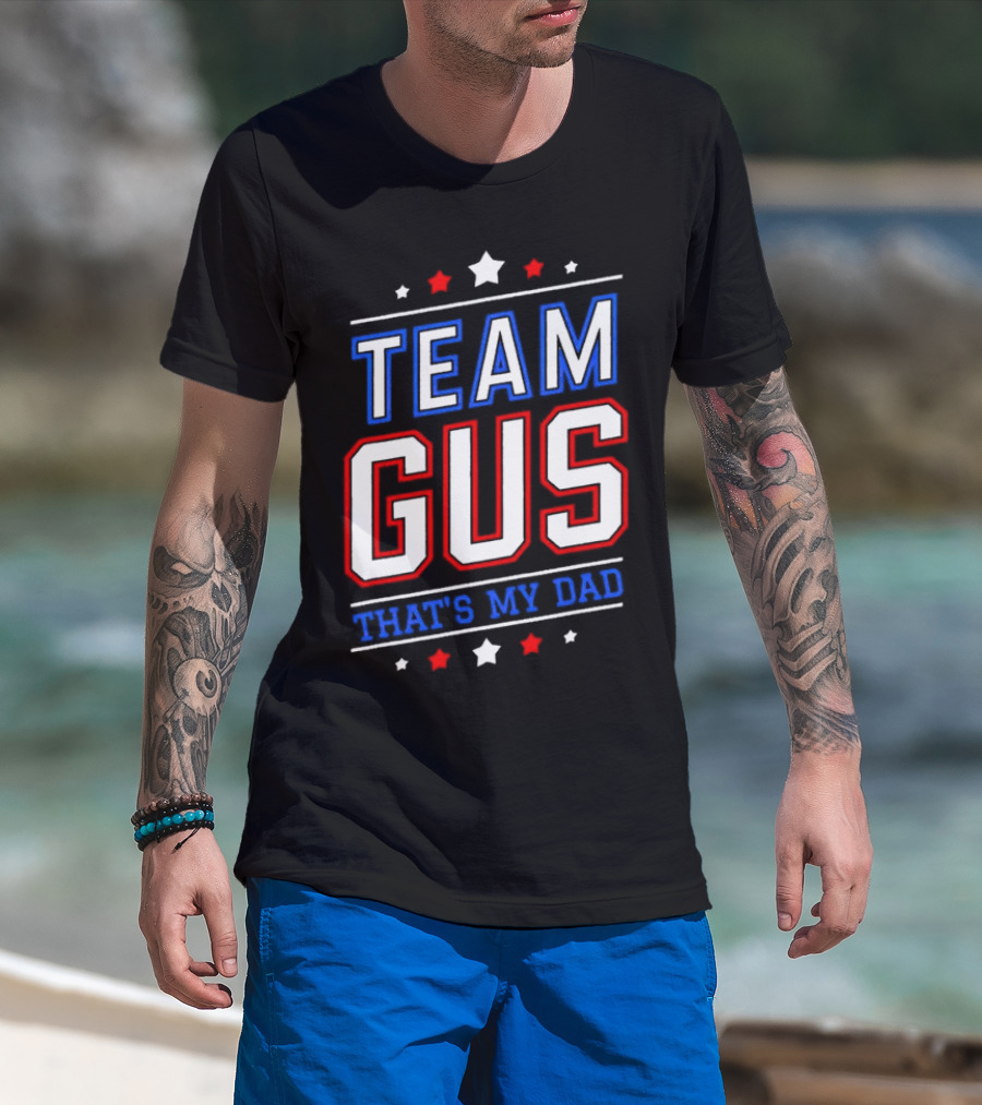 The Team Gus That's My Dad Patriotic T-shirt is designed for everyday wear and a consistent fit. Fabric is pre-shrunk ring-spun cotton with durable stitching. See the size chart below for exact measurements.