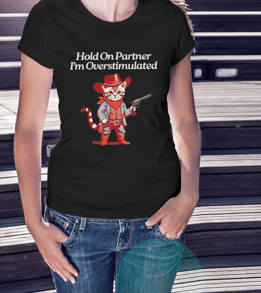 Cowboy Cat Hold On Partner I'm Overstimulated Retro Western T-Shirt