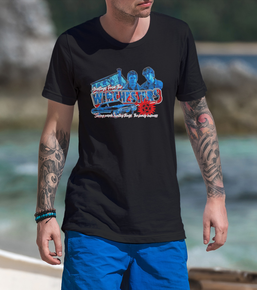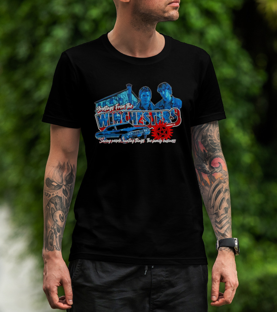 The Greetings From The Winchesters Saving People Hunting Things The Family Business T-shirt is designed for everyday wear and a consistent fit. Fabric is pre-shrunk ring-spun cotton with durable stitching. See the size chart below for exact measurements.