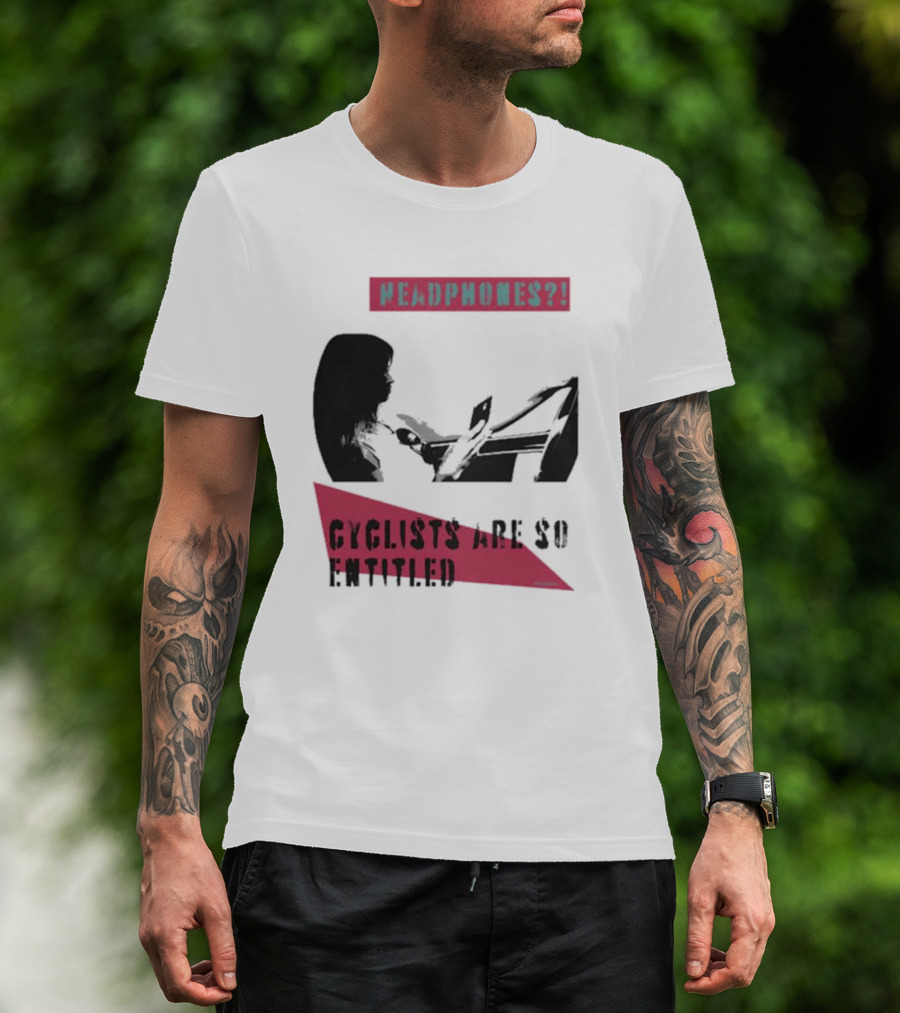 The Headphones? Cyclists Are So Entitled T-shirt is designed for everyday wear and a consistent fit. Fabric is pre-shrunk ring-spun cotton with durable stitching. See the size chart below for exact measurements.