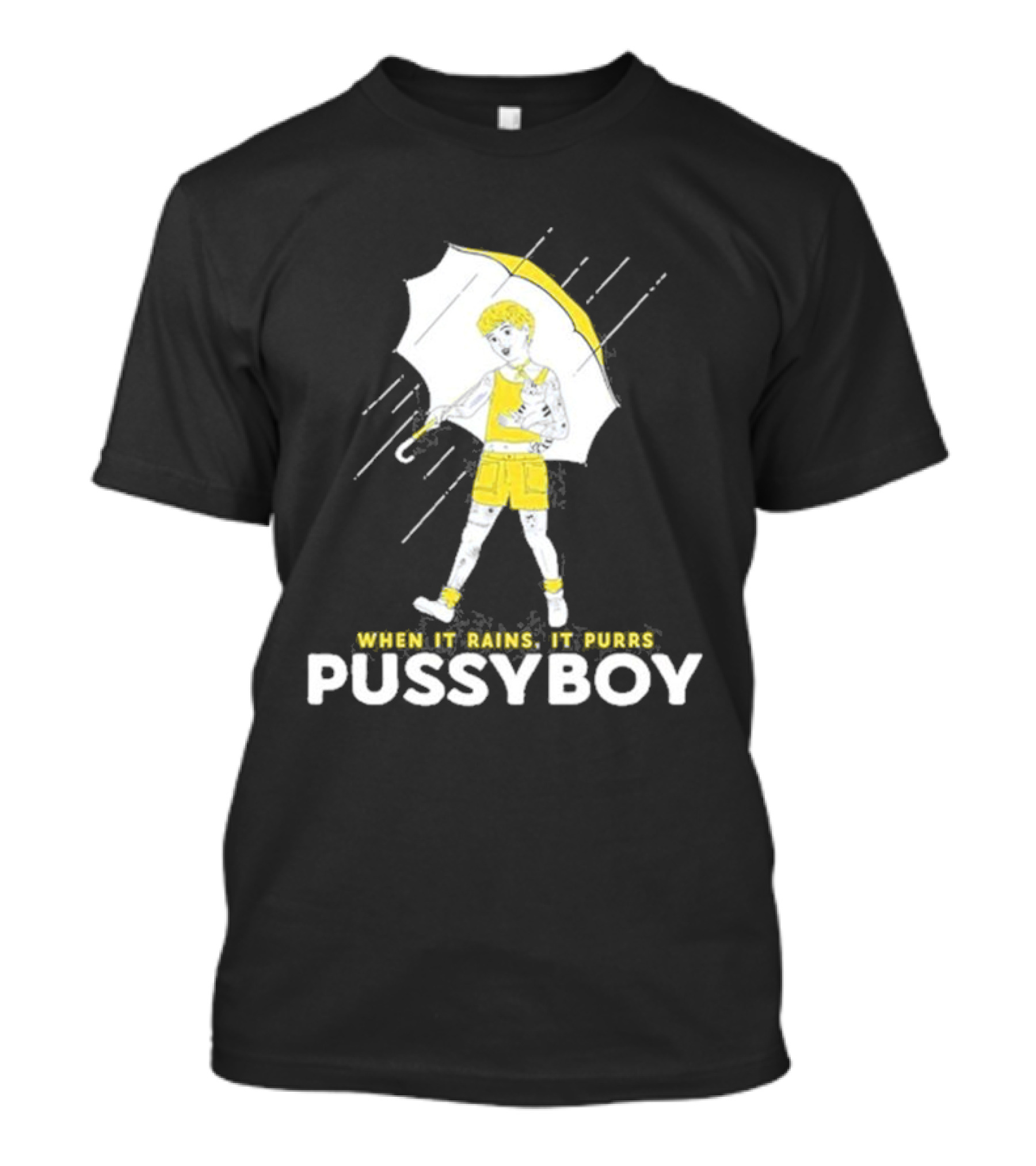 The When It Rains It Purrs Pussyboy Umbrella Yellow T-shirt is designed for everyday wear and a consistent fit. Fabric is pre-shrunk ring-spun cotton with durable stitching. See the size chart below for exact measurements.