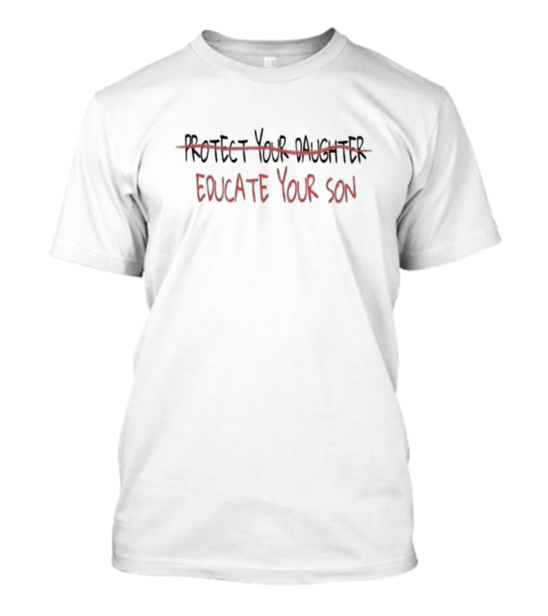 The Educate Your Son Protect Your Daughter Crossed Out T-shirt is designed for everyday wear and a consistent fit. Fabric is pre-shrunk ring-spun cotton with durable stitching. See the size chart below for exact measurements.