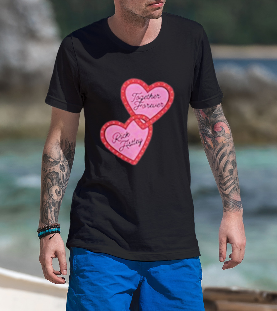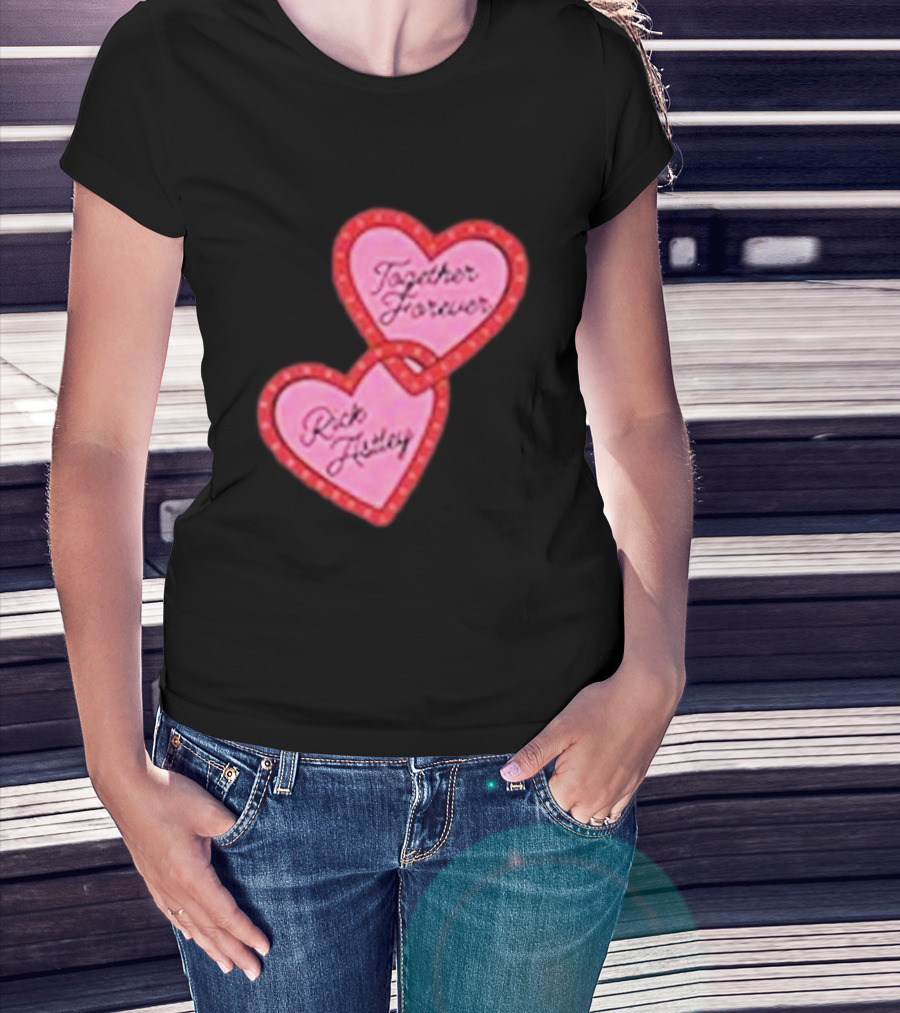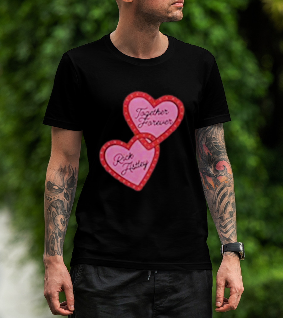 The Together Forever Rick Astley Hearts Black T-shirt is designed for everyday wear and a consistent fit. Fabric is pre-shrunk ring-spun cotton with durable stitching. See the size chart below for exact measurements.