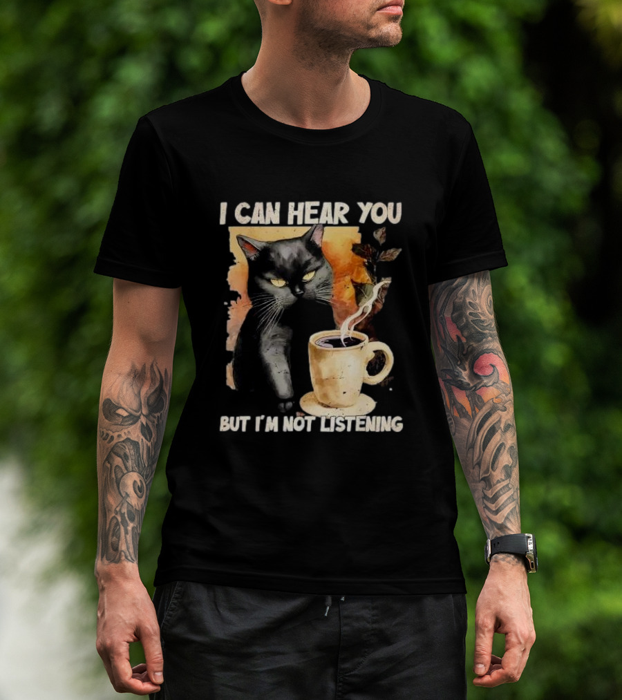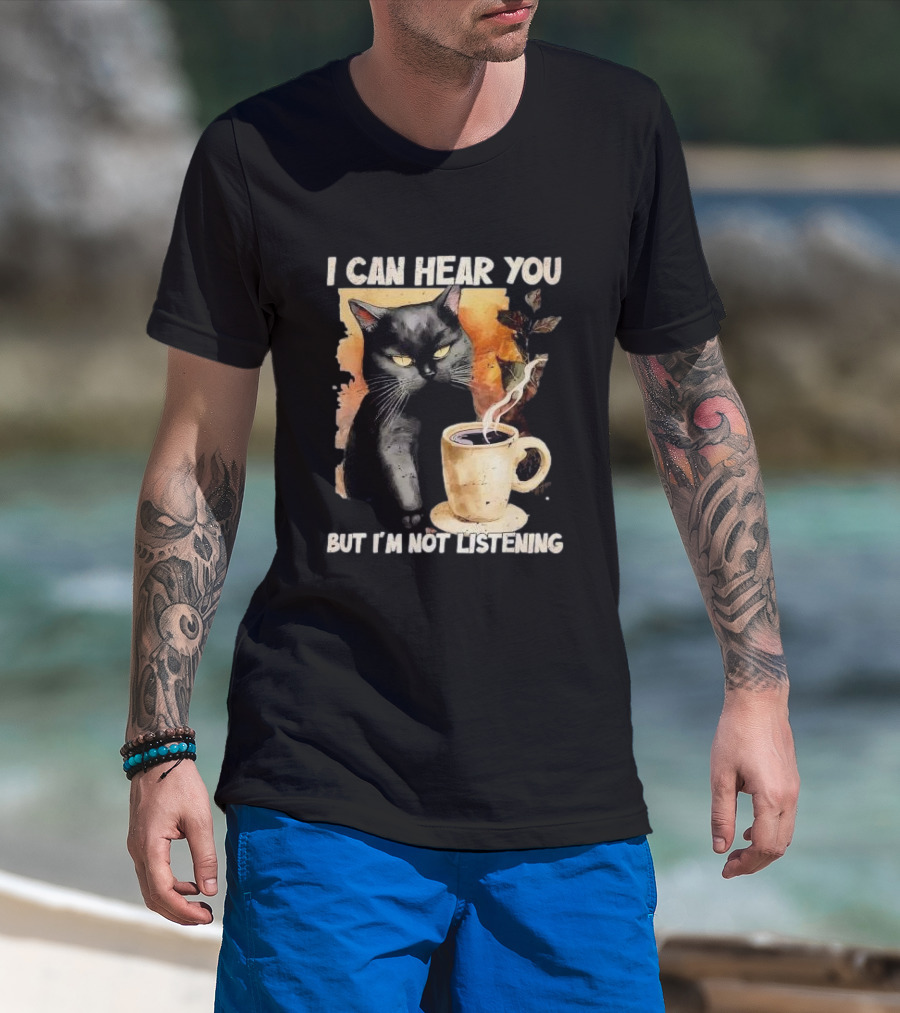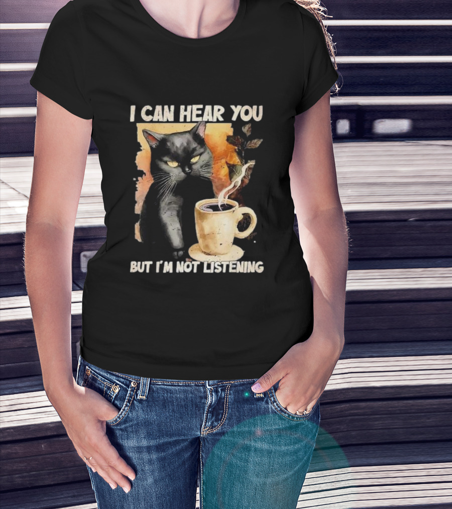 I Can Hear You But I'm Not Listening Black Cat And Coffee T-Shirt