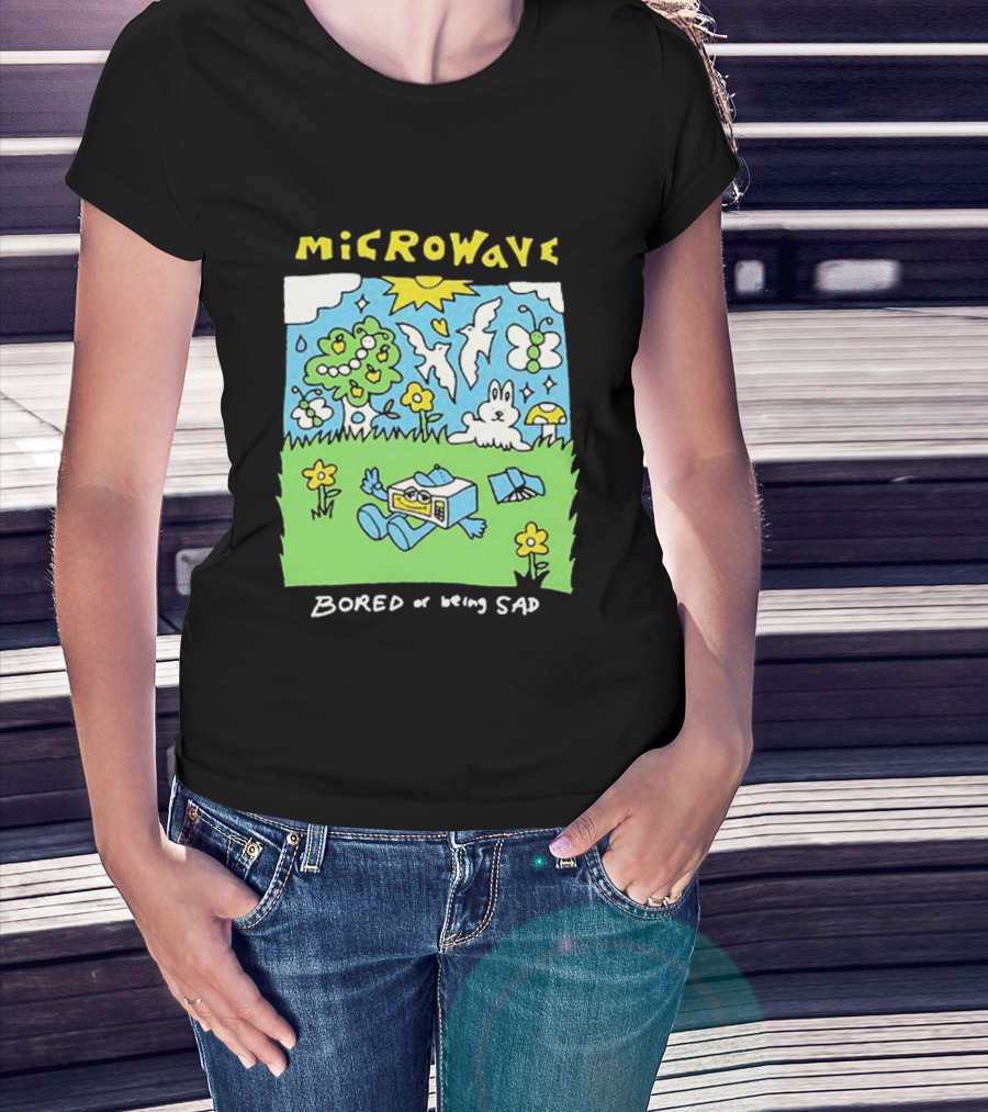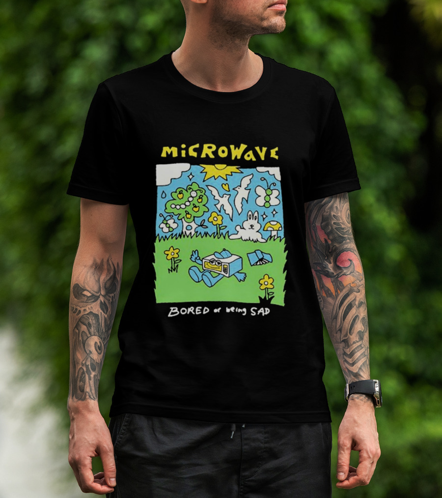 The Microwave Bored of Being Sad Colorful Cartoon Landscape with Sun and Bunny T-shirt is designed for everyday wear and a consistent fit. Fabric is pre-shrunk ring-spun cotton with durable stitching. See the size chart below for exact measurements.