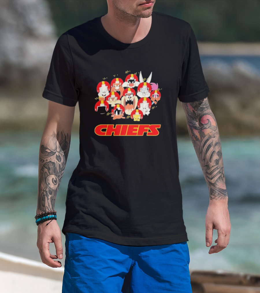 The Looney Tunes Characters Chiefs Helmets Kansas City Chiefs T-shirt is designed for everyday wear and a consistent fit. Fabric is pre-shrunk ring-spun cotton with durable stitching. See the size chart below for exact measurements.