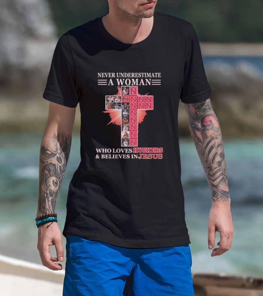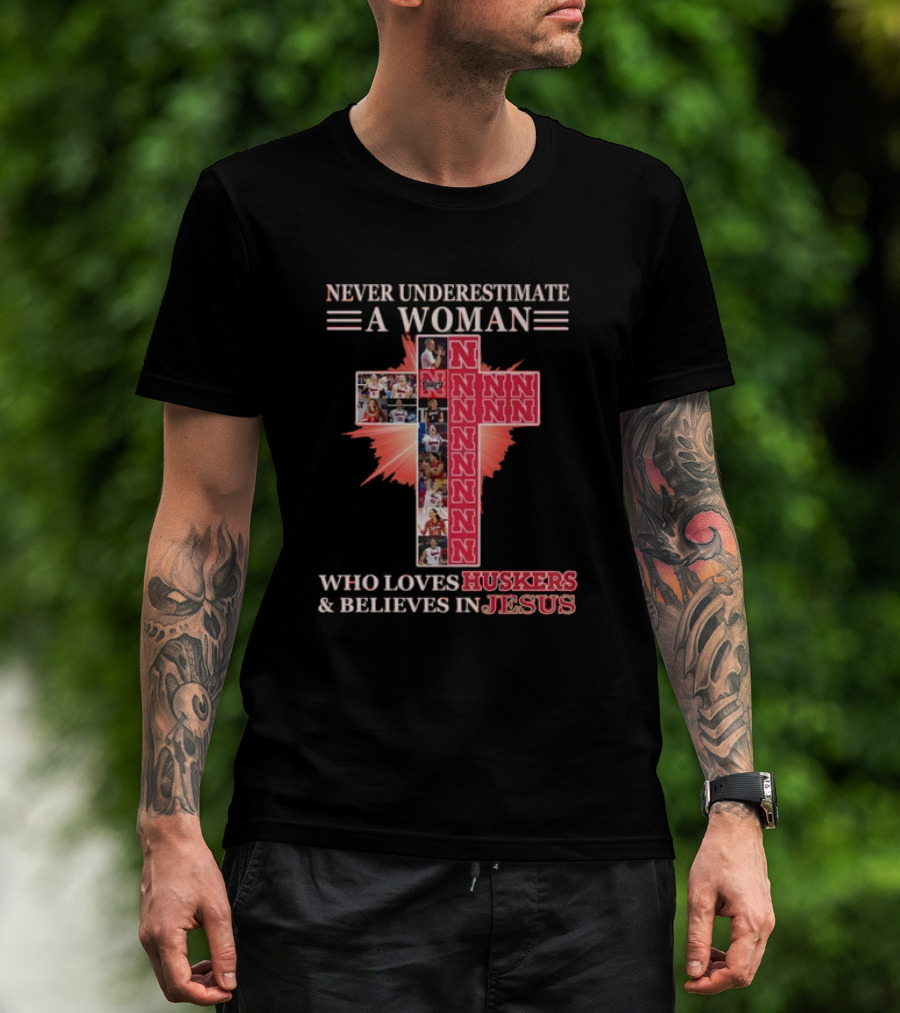 Never Underestimate A Woman Who Loves Nebraska Huskers And Believes In Jesus T-Shirt