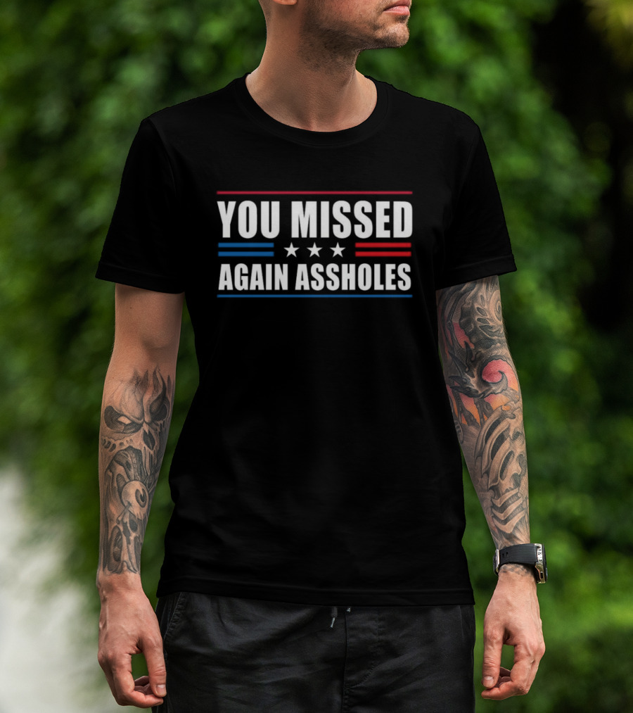 You Missed Again Assholes Three Stars Patriotic Red White Blue Stripes T-Shirt