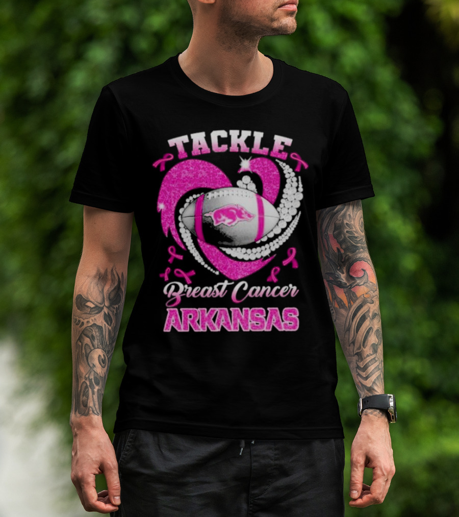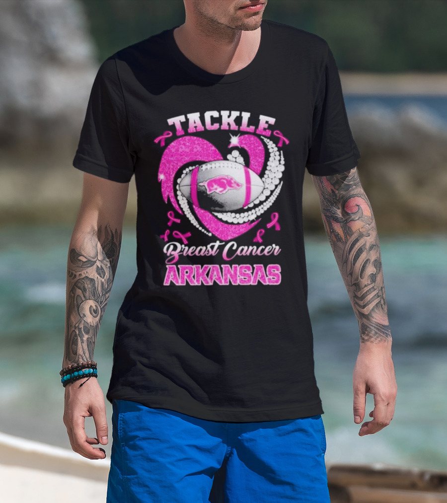 Arkansas Razorbacks Tackle Breast Cancer Pink Ribbon Heart Football T-Shirt