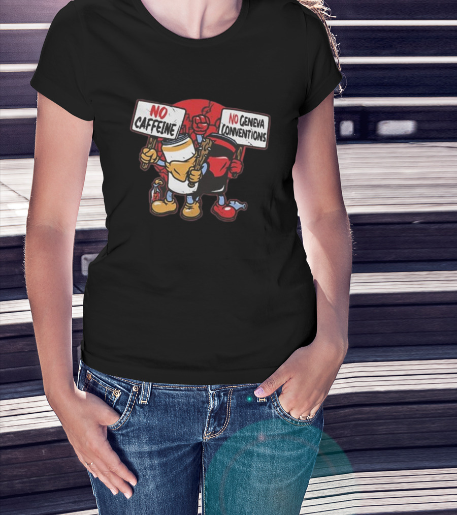 No Caffeine No Geneva Conventions Protest With Animated Coffee Cup And Soda Can T-Shirt