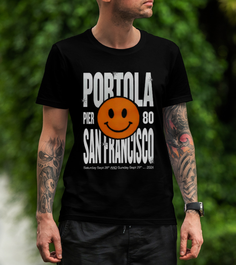 The Portola Smiley San Francisco Pier 80 September 28-29 T-shirt is designed for everyday wear and a consistent fit. Fabric is pre-shrunk ring-spun cotton with durable stitching. See the size chart below for exact measurements.