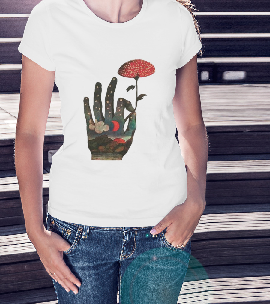 Fly Agaric Psychedelic Hand With Night Sky And Moon T-Shirt